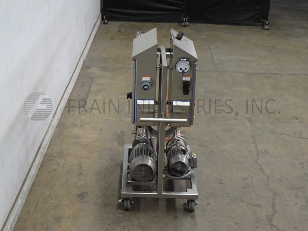 Back to All Equipment纯英奇nuity stainless steel skid mounted CIP circulation cart. Equipped with (1) Fristam model FZX2100 liquid ring pump with a 2½”OD / 2″ID Tri-clamp suction infeed and 2½”OD / 2″ID Tri-clamp discharge powered by a 3 hp drive at 1760 rpm. Skid also includes (1) FPX722-145 centrifugal pump with a 2½”OD / 2″ID Tri-clamp suction infeed and 2½”OD / 2″ID Tri-clamp discharge powered by a 7½ hp drive at 3520 rpm. Control panel with AB PLC and touch screen HMI.