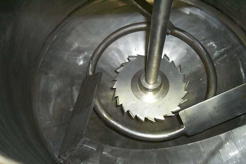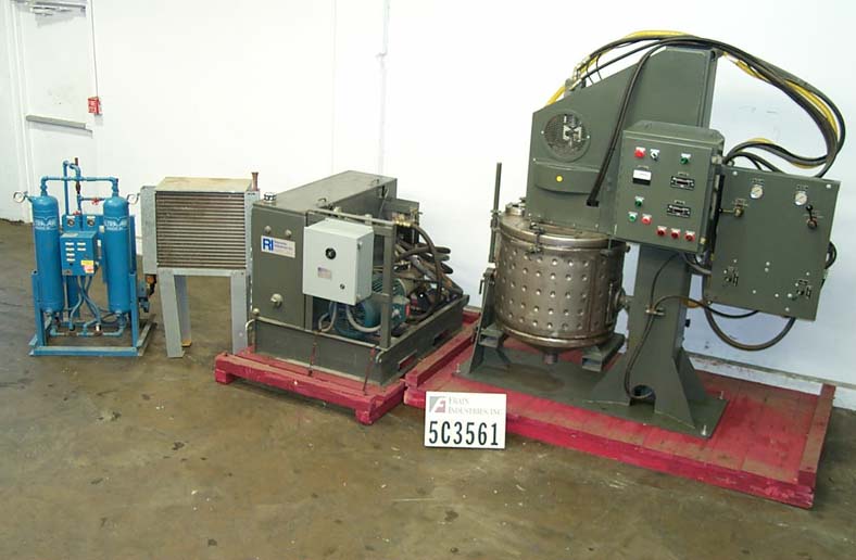 返回所有设备高速双行动分散搅拌机与一个36”液压升降机。有一个不锈钢轴和10 "锯齿分散刀片转速范围0-2290。此外,还附带一个50加仑不锈钢波纹夹套罐,额定压力为15psi,中心底部有3英寸的排放,低速双向扫/刮搅拌器设置在0-100rpm。坦克被设置为倾斜15度,总共120度。具有多个产品端口和循环粉泵以及集尘端口。配备一个20马力马达和21加仑/分钟泵。马达安装在基座上,带有85加仑的循环油箱和所有必要的阀门。