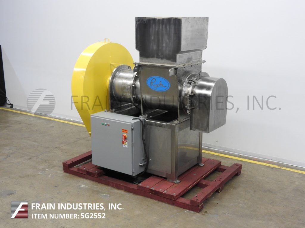 返回所有设备Rietz RE24K7E型,不锈钢,挤出机,用于研磨冷冻、部分冷冻或完全解冻的40磅块状产品,每小时40至30000磅,具体取决于材料和应用。配备30”长x 27“宽x 34“深不锈钢缝隙免费产品料斗(6)10“长x 7“高锤叶片8日”OD轴(6)5”长x 8高固定铁(没有刀/没有加强,低维护),24”ID扶轮产品减少港口,自动打开,用插销固定盖,减速筛(每应用更换部分),75英寸地板间隙,链条到链轮40马力电机驱动,安全防护,启动/停止按钮控制,e-stop。安装在底座框架的(4)支腿螺栓上。