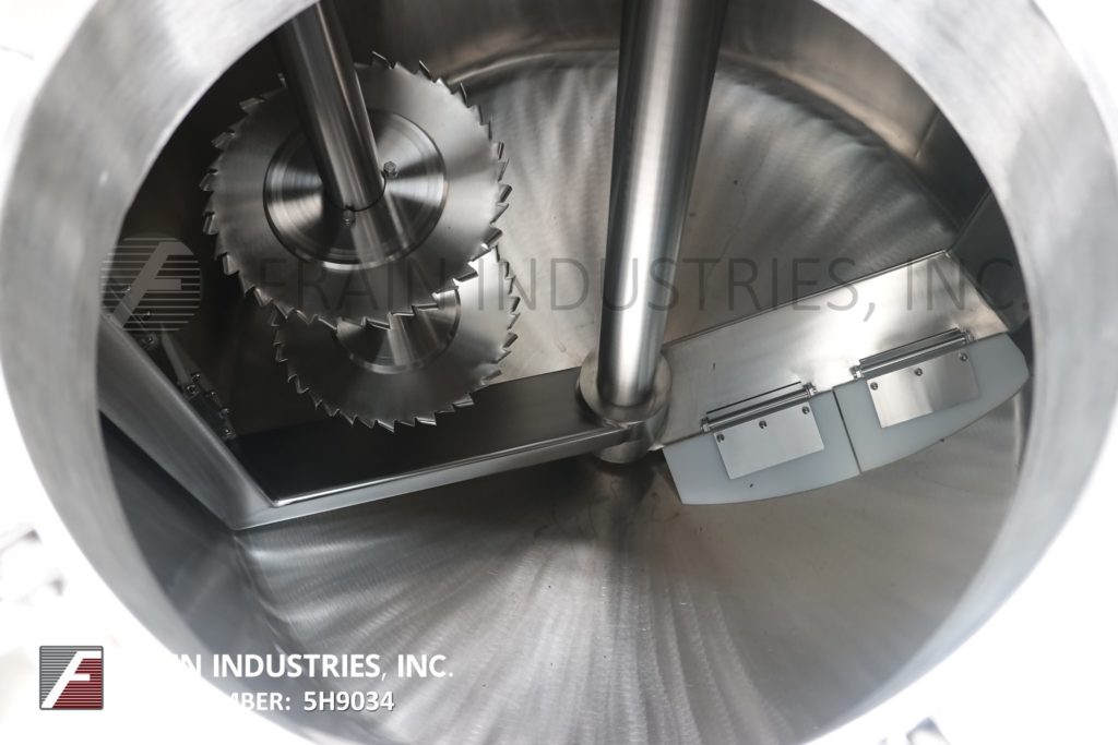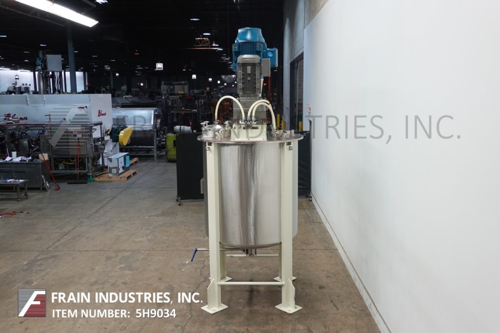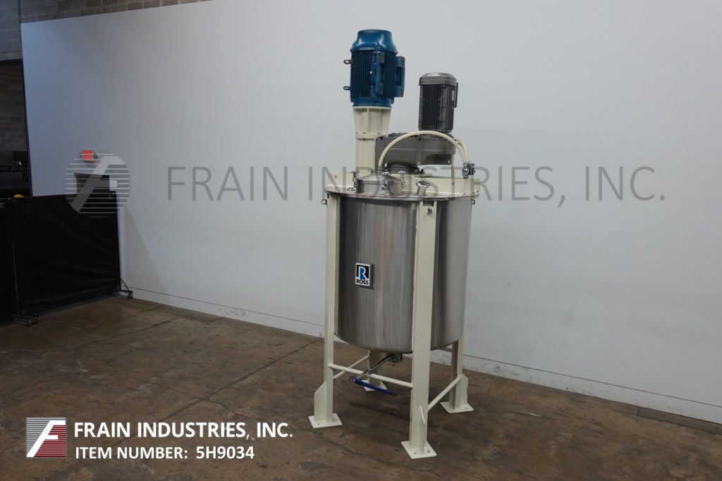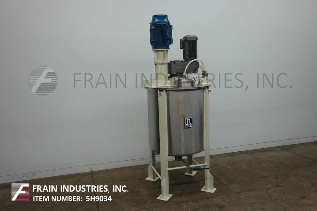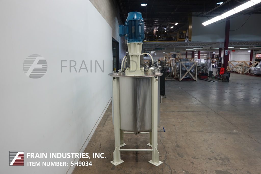 返回所有设备罗斯,FDA-500型,500加仑,316不锈钢混合罐。容器尺寸:55"直径x 60"深55"直壁。配备平顶,16"外径翻转/夹紧式人路,中心桥安装25马力刮面搅拌器,50马力高速锯齿搅拌机和(3)CIP喷雾球。碟底有3½“外径/ 3”ID三夹中心底部放电与23“地板间隙。安装在(4)腿漆框架上。