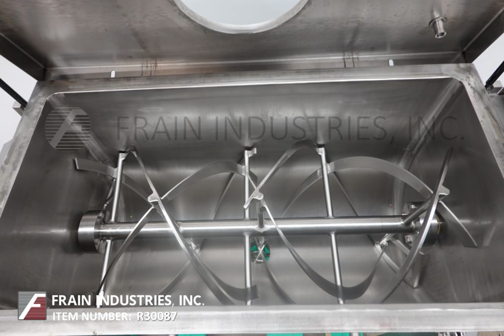 返回所有设备S Howes Co Inc, 10英尺³,316不锈钢,双带搅拌机,每小时产品磅数-取决于材料和应用。表面处理:180 #砂砾抛光。内部尺寸:长度48英寸;24“宽;在深度24”。配备翻转钳下盖,有14"外径中心进口与安全联锁,2"外和1"内宽双间断带安装在3-1/2"外径轴。7"外径,4-1/2"内径卫生中心底部排放,采用蝶阀。控制面板采用触摸板变速变频控制,空气吹扫密封。安装在(4)腿上。