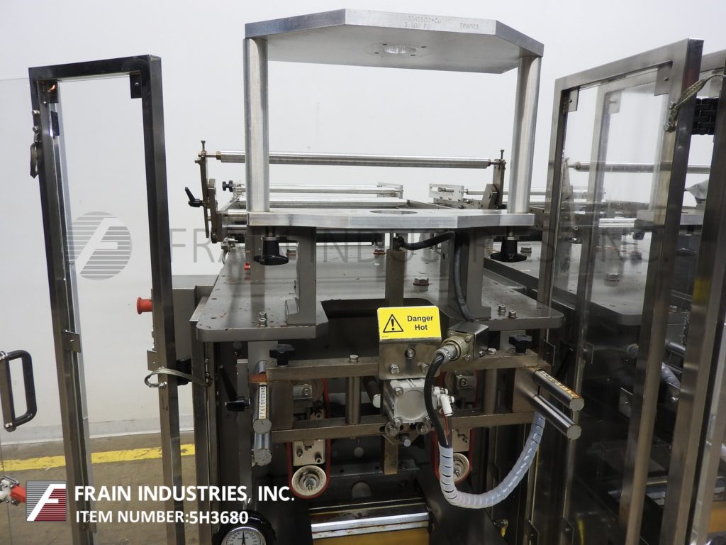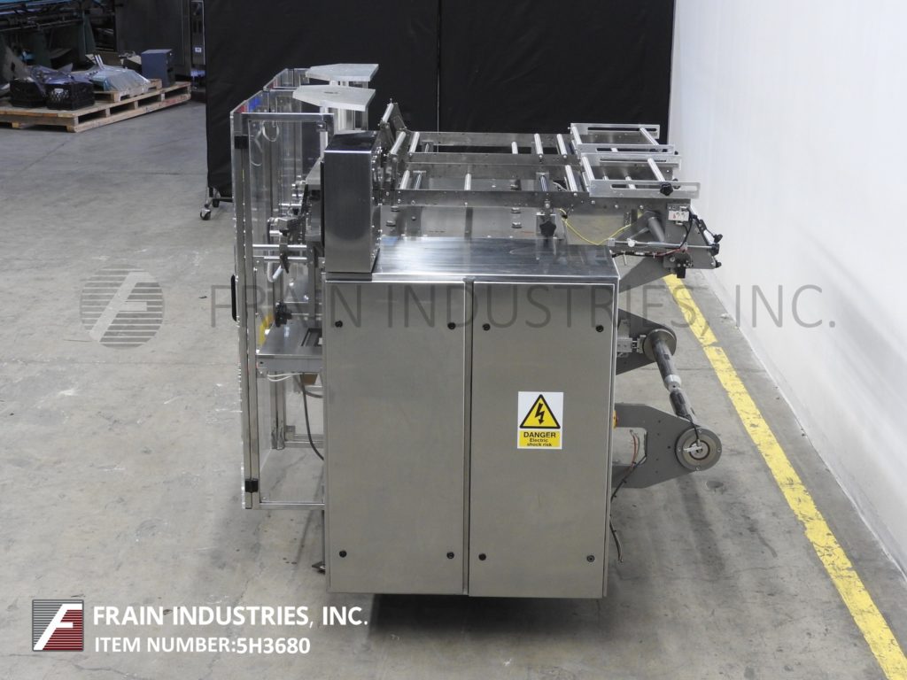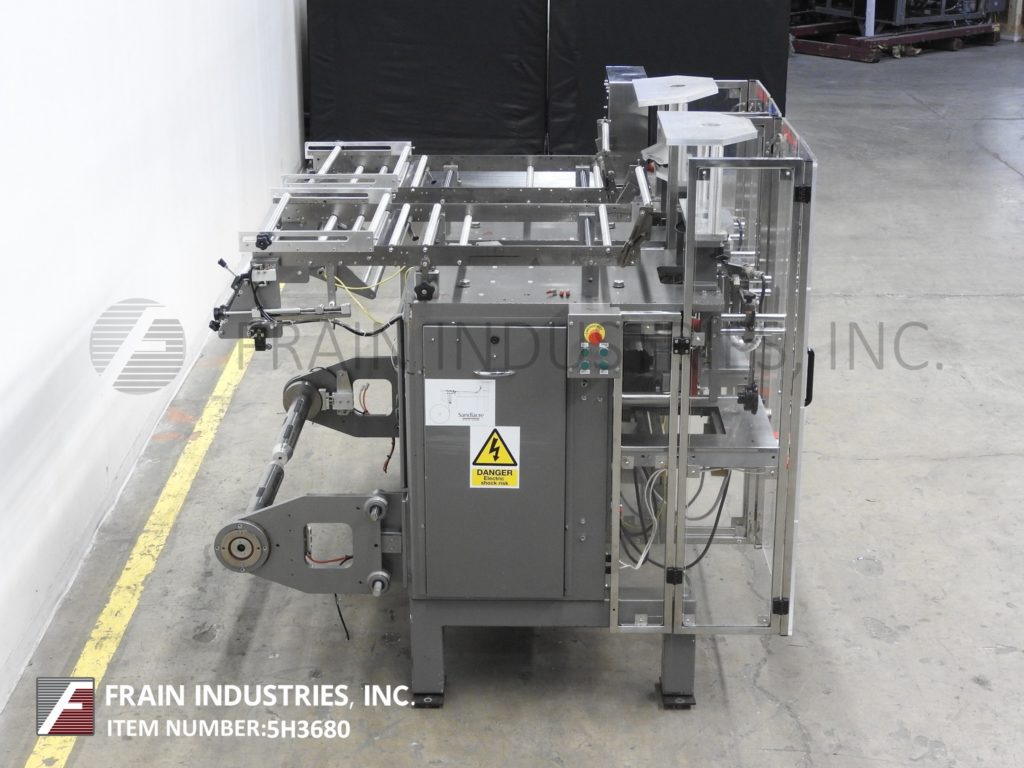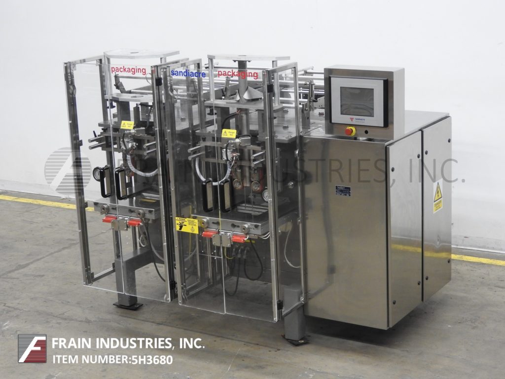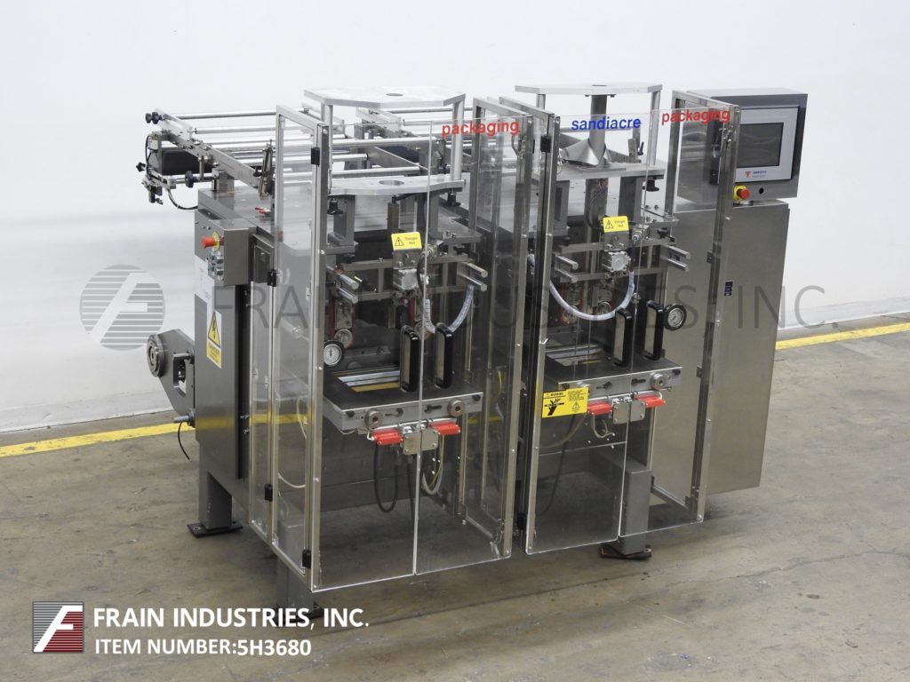 Back to All EquipmentSandiacre, Model TG250LDT vertical, sevro driven, continous motion, stainless steel, twin tube form, fill and seal machine rated from 40 to 220 pouches per minute – depending on materials and application. Bag size range: 2.36” to 9.84" in Width; up to 15.74” in Length. Equipped with 10" wide hot knife seal jaws,16" long vertical lap seal, dual side film belt assist, static eliminator. Film specification: up to 23.62" web width up to 36" in diameter; on 3" OD core with adjustable film tracking. Control panel has A/B PLC with touch pad controller and digital read out, with start, stop and E-stops, . Mounted on steel base frame with interlock safety guarding.