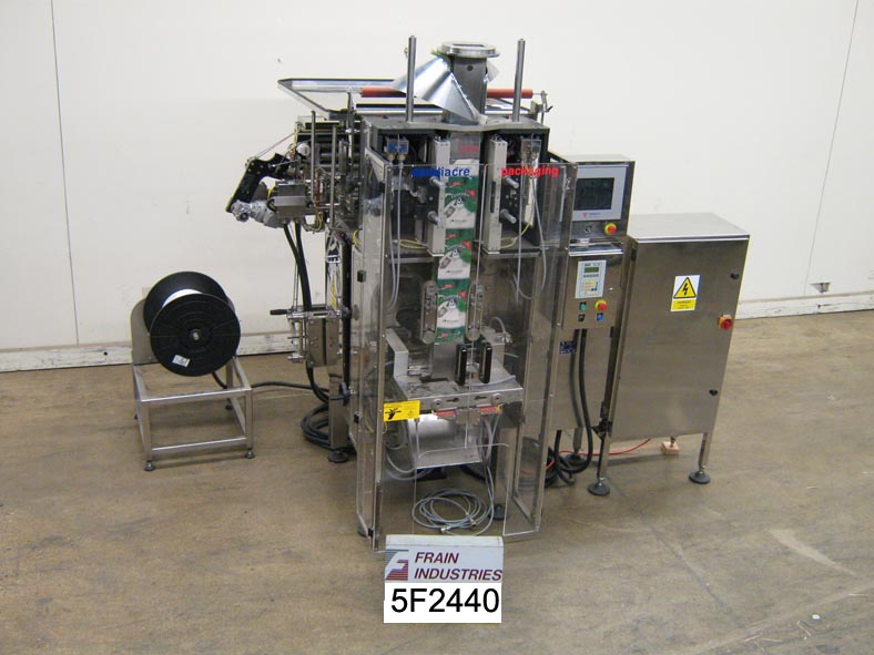 Back to All EquipmentSandiacre Model TG320LDQZ, automatic, intermittent motion, form / fill / seal machine rated from 20 to 100 bags per minute – depending on materials and application. Bag size range: 3.1” – 12.6" in Width; up to 19.7” in Length. Equipped with film splice station, servo controlled film tracking, registration, transverse zipper attachment, Quad Pack rectangle forming system for (4) side creasing to form square bag, 20" vertical seal assembly, dual side film assist belts, flat bottom forming system, 13" x 2" serrated hot knife seal jaw, e-stop and interlocking safety guarding. Servo drive and AB PLC with panel view. Film Specification: up to 36" diameter; up to 32" wide. Mounted on heavy duty base frame.
