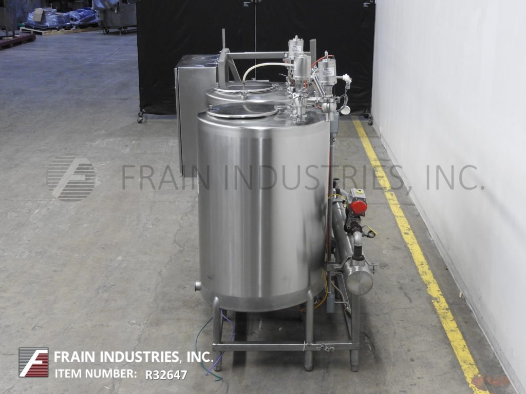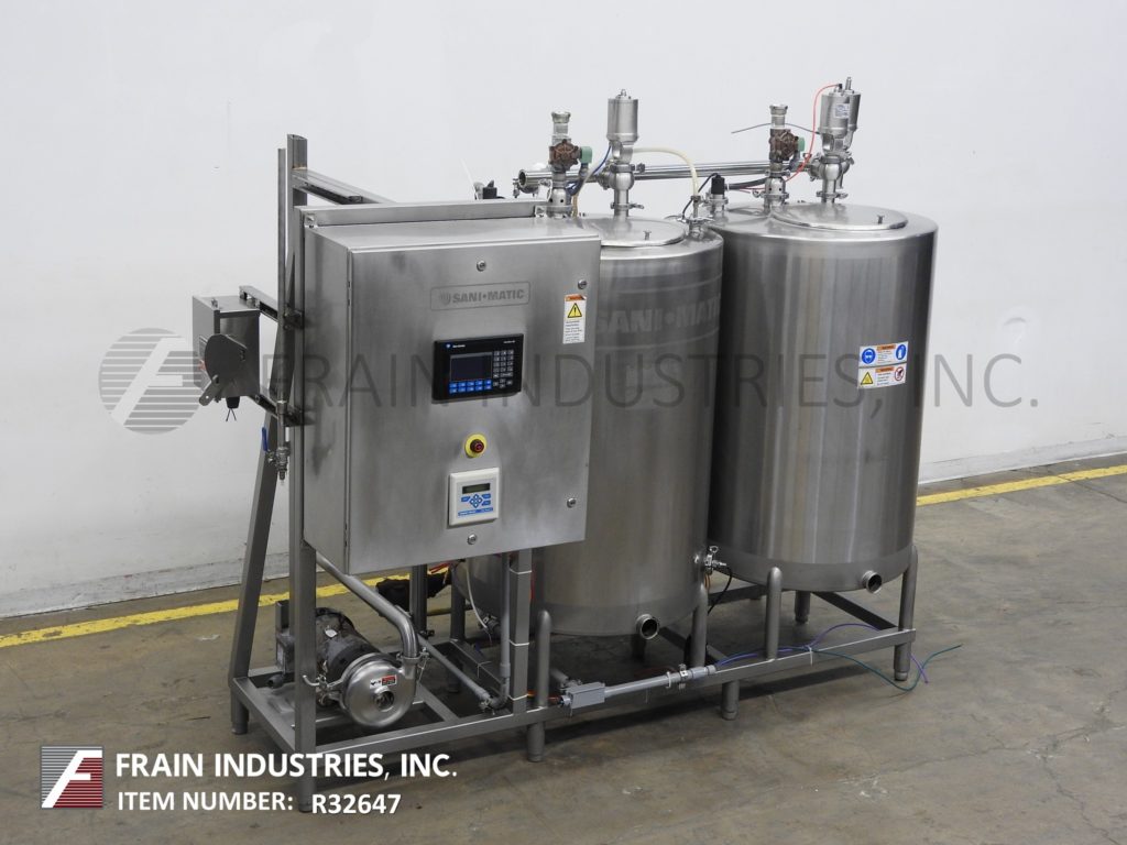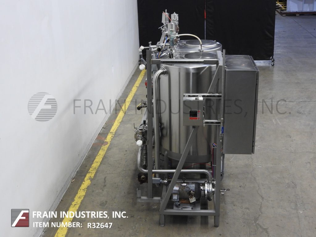 返回所有设备Sani-Matic,型号(2)水箱,不锈钢,CIP系统。配备(2)30"外径x 48"高约125加仑,不锈钢,单壁罐,(1)用于洗涤剂,(1)用于冲洗,两者都有17" ID顶部人孔,可翻转盖,平顶(1)"和(2)2-1/2"卫生顶部端口,倾斜的底部有3个“OD底部排放17”地板结算六个半“OD x 64”长不锈钢管壳换热器MAWP 130 psi的壳牌和150 psi管@ 375度F和MDMT壳管-20度F @ 150 psi和前端都有一个法兰端口(8)3/8“3-1/4螺栓孔”中心,不锈钢管道,卫生级联轴器流量和压力控制阀,侧装离心泵,2"外径顶部和3-1/4"外径前端产品端口。控制面板有A/B控制器和A/B触摸板控制和显示。安装在(8)腿不锈钢框架上。