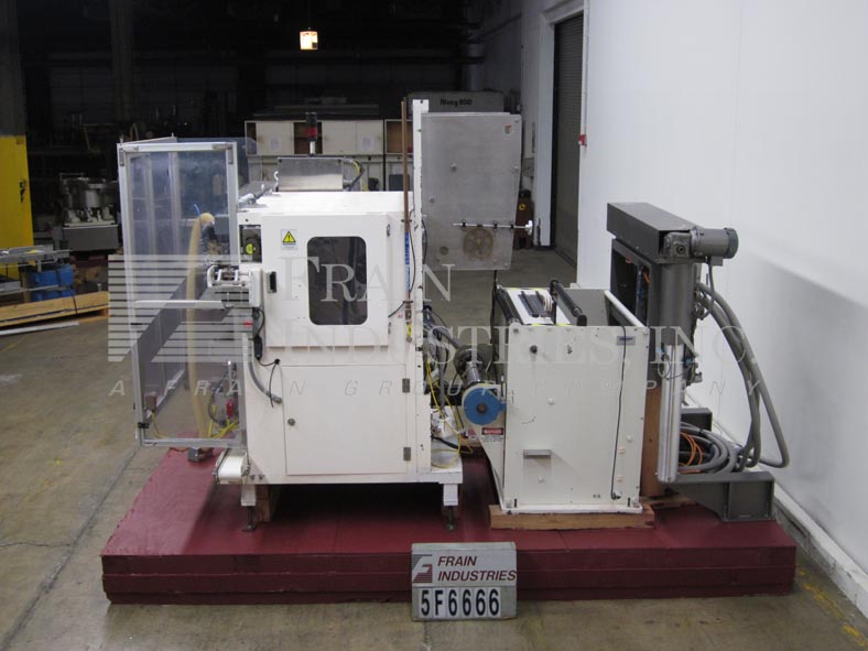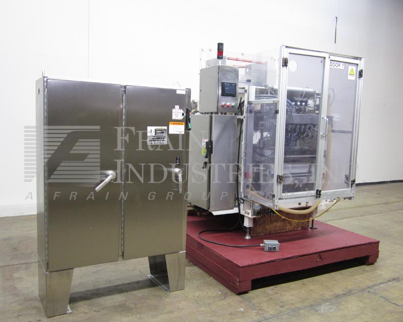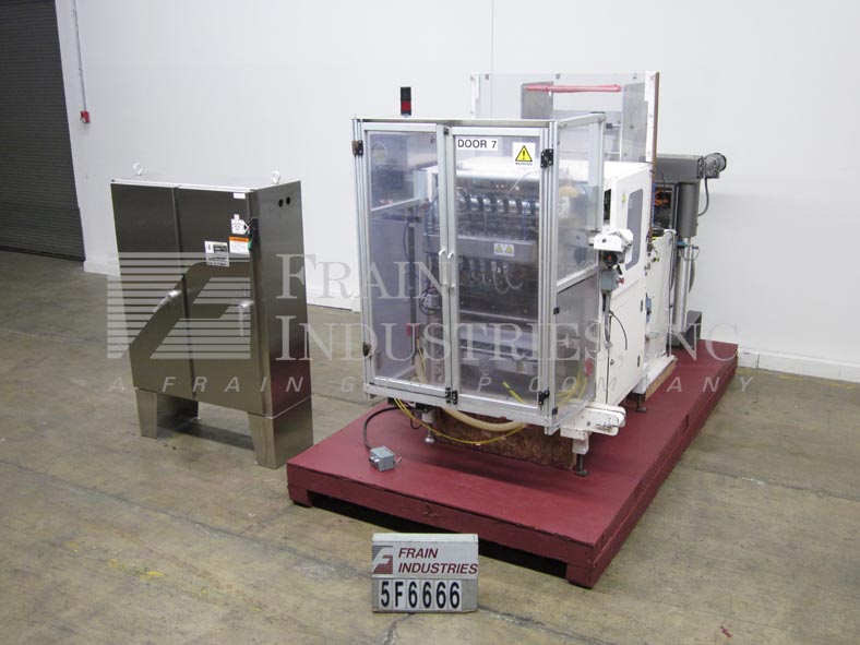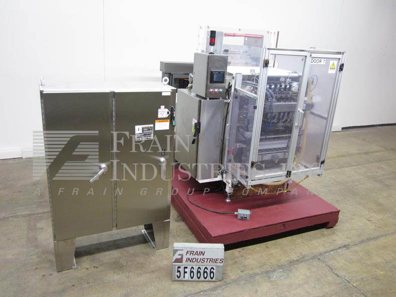 返回所有设备Sanko 6-up型,自动,垂直,伺服驱动,粉末棒包装,成型/填充/密封机与螺旋填料额定20至60次/分钟-取决于材料和应用。包装尺寸范围:2- 3/4"至7-1/2"或(70mm - 190mm)长度;1/2"至2"或(10mm - 50mm)宽度,适当更换零件。填写范围:1 - 30毫升。配备所有填充模型M400 SV6伺服驱动螺旋填料与产品料斗安装上面贴包装机,“电影卷与驱动电影饲料,拼接站,6旋转切刀,6形成管9”长垂直夹翅片热封口的下颚和2”宽水平热封口的下巴,袋卸料溜槽与45“长x 5”宽cleated卸料输送机在6“中心和薄膜废料清除。控制面板有A/B CPU控制器,面板视图,统计灯条和安全防护。安装在高度可调(4)腿基础框架。