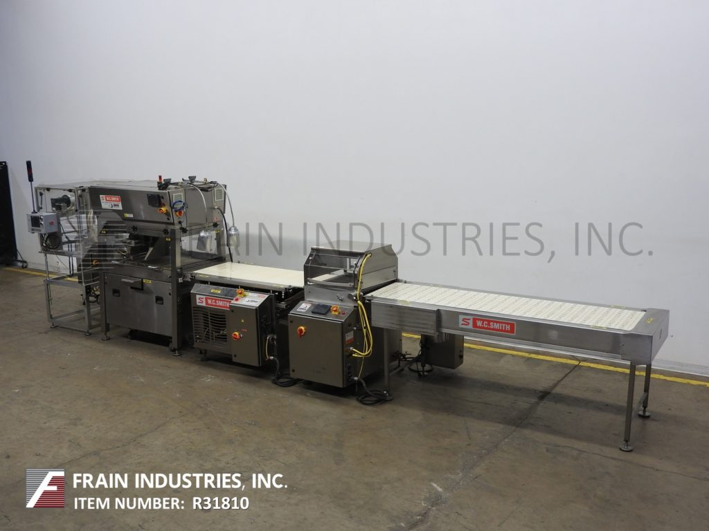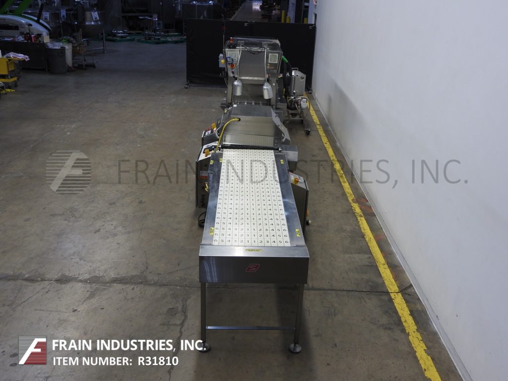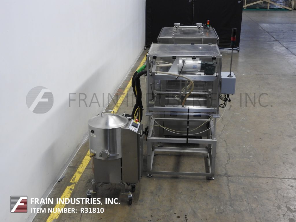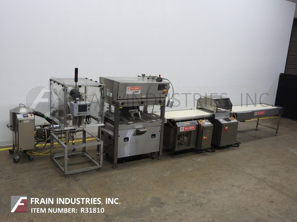 返回所有设备Savage Brothers(W.C.Smith)全套、24英寸宽、自动、直列、不锈钢、巧克力enrobing装饰线,每分钟产品数量——取决于材料和应用。全不锈钢结构。该生产线包括Savage Brothers 104“长手动装载产品,进料输送机至24”宽的Savage Brothers巧克力预底器(带网带)、带泵的夹套加热罐和冷板输送输送机至Savage Brothers 24”宽的巧克力enrober(带可拆卸加热巧克力储罐和泵、网带、,变速鼓风机和振动筛至24“宽木质纵梁,配有125磅巧克力熔化器。所有装置均安装在不锈钢框架上,并配有调平支腿、独立控制装置和连接输送机。