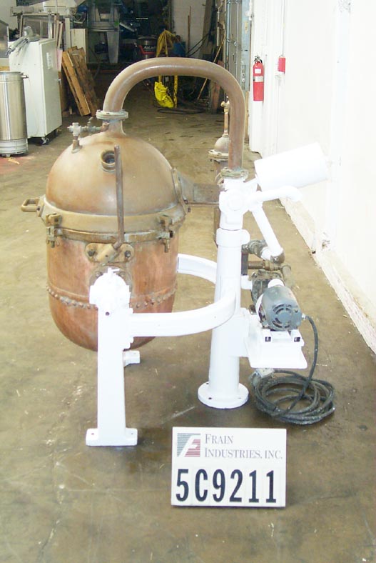 返回所有设备56加仑/ 7.5铜。Ft。通过再循环蒸汽加热的夹套铜真空烹饪容器。具有两个1“O.D.蒸汽的螺纹端口,以及1 1/2”I.D.螺纹容器在船的顶部进入。单位分离和倾斜向前倾斜以便放电(四个夹具在操作期间将两个半部固定在一起)。进入泵由Dayton 3/4 HP提供动力。最后用于巧克力操作以蒸发液体和浓缩产品。24“血管直径。