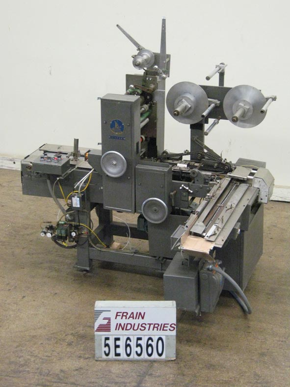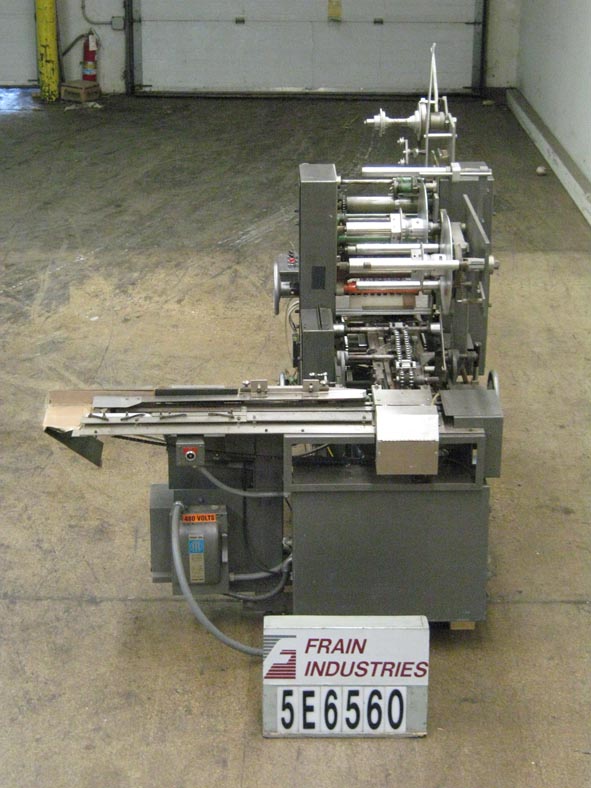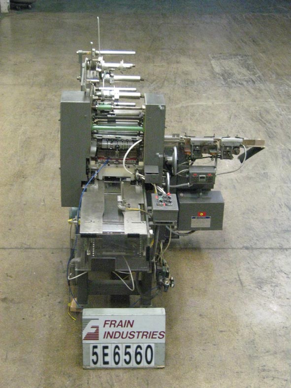返回所有设备Scandia型号607RE,自动,切割,覆盖器,用于单包或多包装,额定值为每分钟80到200包 - 速度取决于材料和应用。包装尺寸范围:7/8“ TO1 3/4”,长x 2-1/4“至8”,宽度x 7/16“至1”。薄膜尺寸范围:2-1/2“至4-5/8”的长度x 3-1/2“至10-1/4”的宽度,并且能够具有适当的热可密封,玻璃纸或聚丙烯薄膜均能运行更改零件。配备了30英寸长的拖延链条进纸和44英寸长的直角延链密封和排放输送机,设置在18英寸中心,饲料和排放高度为34英寸。双膜卷,旋转刀,塔克,顶部和底部文件夹,顶板和侧面加热密封剂,无包装 /没有膜,带有单独的热密封,静态,静态,网络速度控制,带有开始停止,电子停车和机械离合器。设计用于制作香烟样式包装。