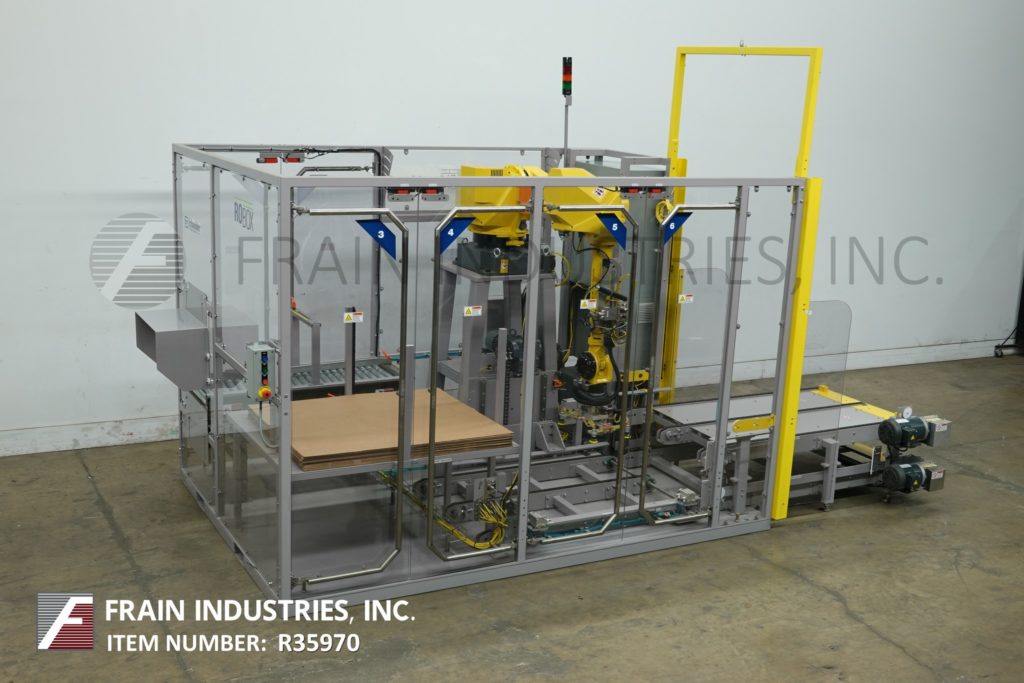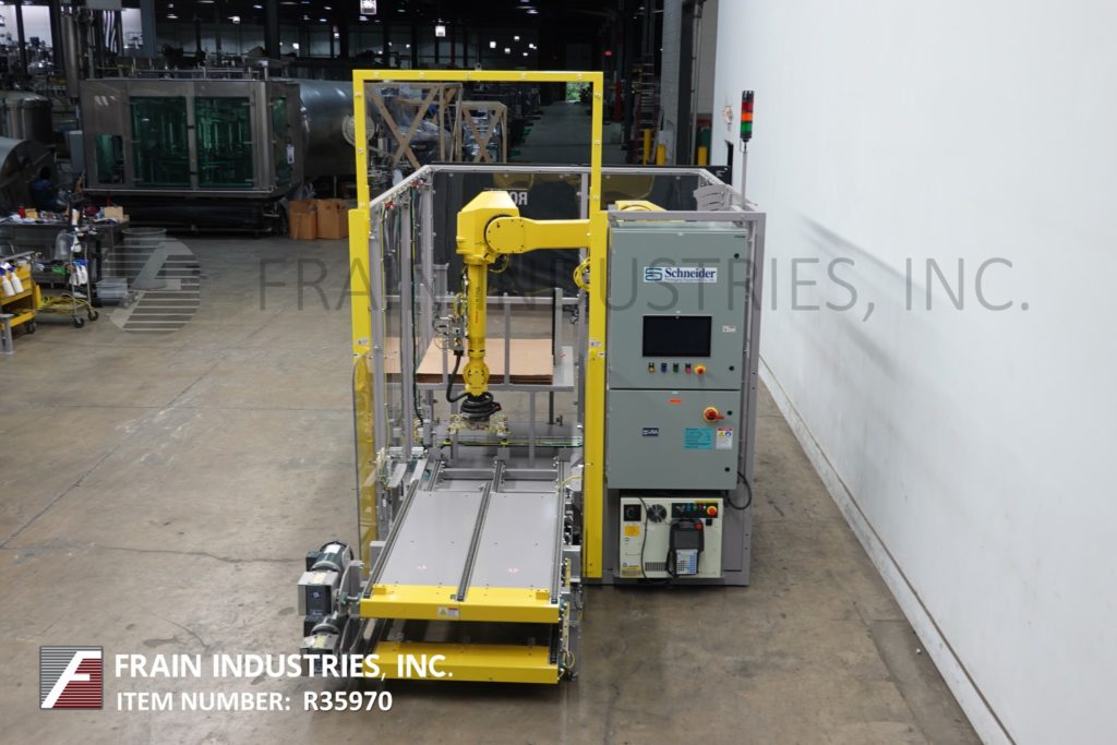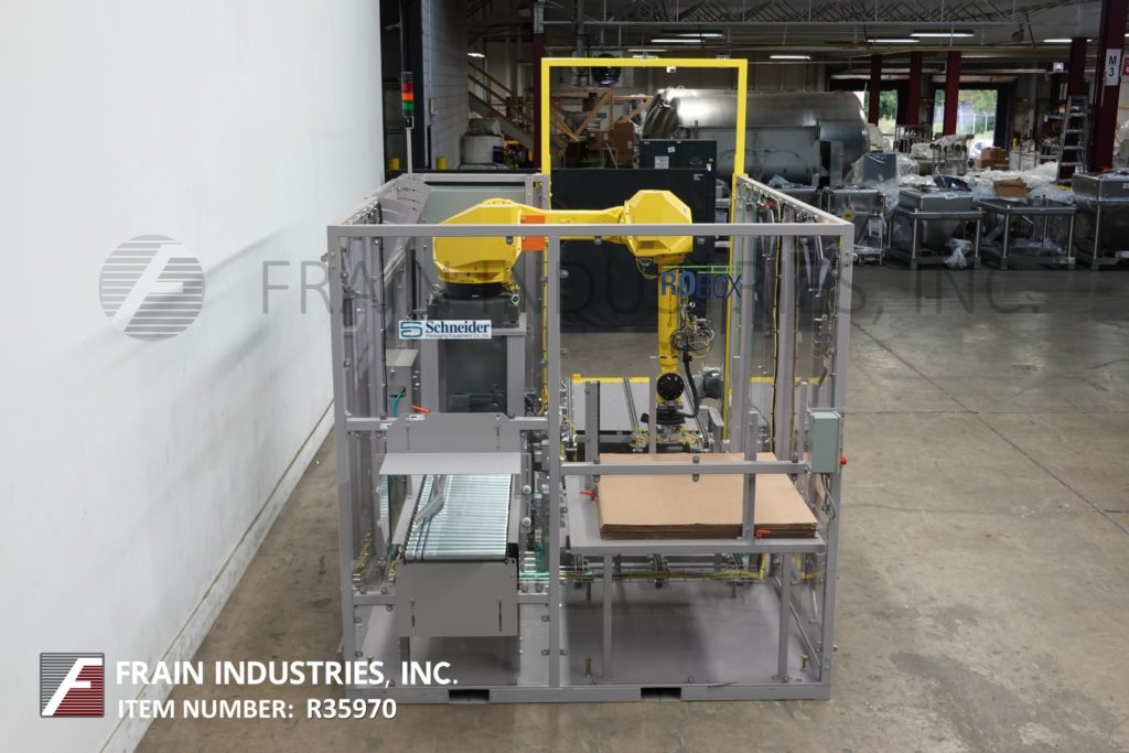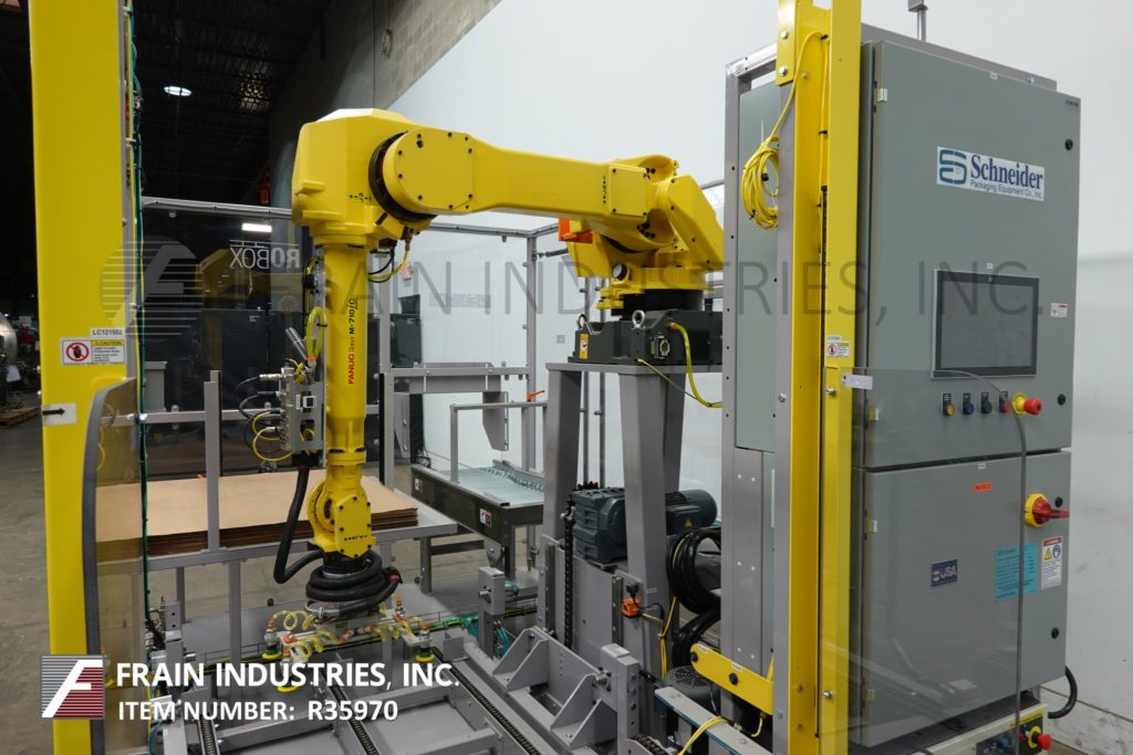 Back to All EquipmentSchneider模型Robox,机器人palletizing system with (5) axis, articulated, rotary joint, servo driven, robotic, pic-n-place arm rated from 1 to 10 cycles per minute with number of product – depending on materials, application, machine configuration and pack pattern. Painted carbon steel construction. Case size range: 6.5" to 22" in length, 4.5" to 16" in width and 3" to 16" in height. Pallet dimensions 48" x 40" x 4.5". Maximum pallet load size: 41" x 48" x 80". and sheet sizes 30" x 30" to 48" x 40" vacuum pickable. with maximum pick-up weight of 50 kg. Ambient temperature of 35º F to 100ºF and 95% RH non-condensing. Magazine pallet sheet and layer sheet capable. Fanuc M-7 10iC/50H Robot, with vacuum tooling end arm affector. Over / Under conveyor, has (3000 pound) capacity and 20 second cycle. Double (2) locking doors on perimeter guard located along the length of pallet provides operators easy access to pallet and has 80" long infeed conveyor with 30" to 36" infeed height and 0" to 15" discharge height. Control panel has Rockwell Automation Compact GaurdLoix PLC with VersaView 12" touchscreen HMI and statis light bar. UL Compliance, inspection and labeling of main electrical enclosure. Mounted on heavy duty frame.