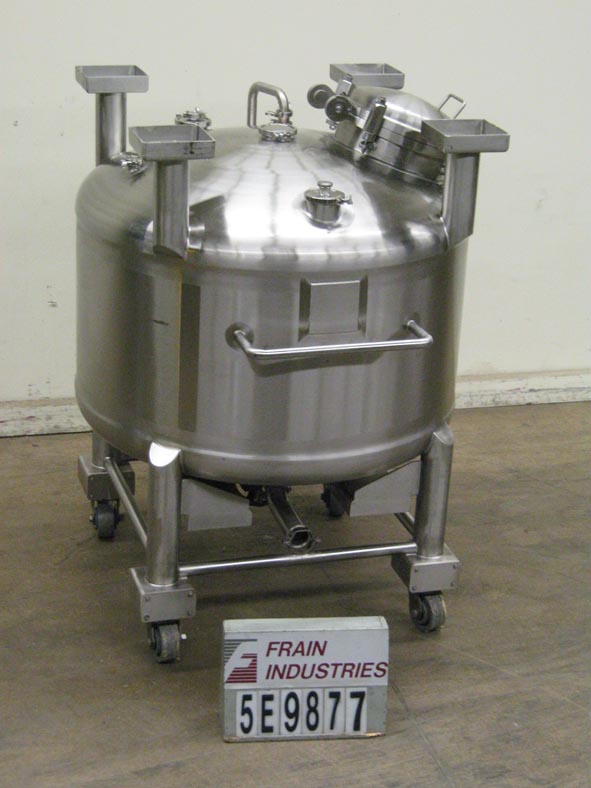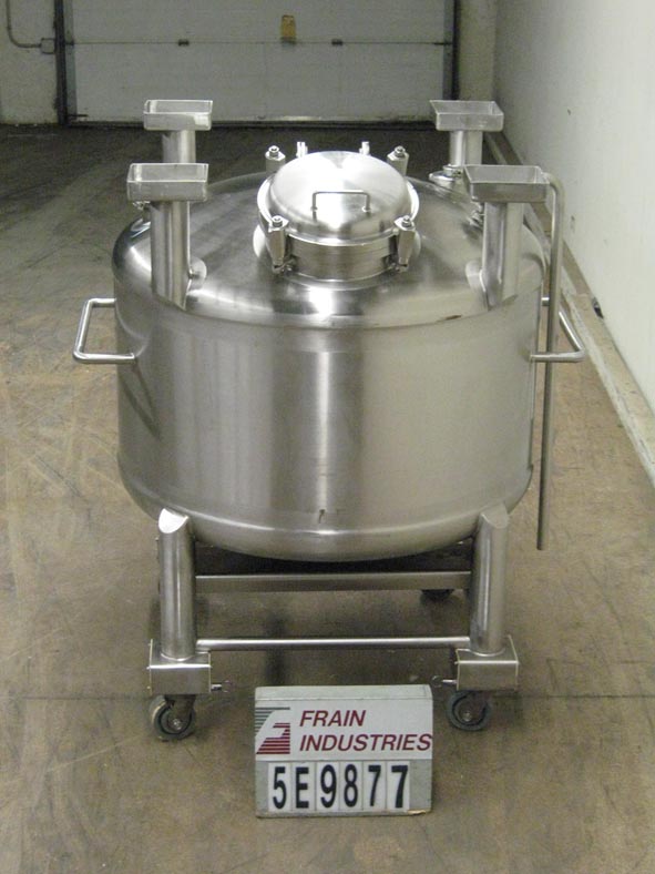 返回所有设备Seitz不锈钢,1000升(264加仑),316不锈钢,输送罐。内部尺寸:54"直径x 27"直壁。内部压力等级:75psi @ 284°F,全真空等级:-20°F @ 75psi。配备圆顶顶,16"直径人的方式与螺栓下盖,三个1-1/2"三叶草连接,两个4"三叶草连接,两个侧面安装推动手柄,一个3"齐平安装中心底部排放与手动曲柄隔膜阀。室内装修:。240粒。外部饰面:140沙砾,安装在可堆叠的不锈钢框架上,配有叉车转轮和锁紧脚轮。