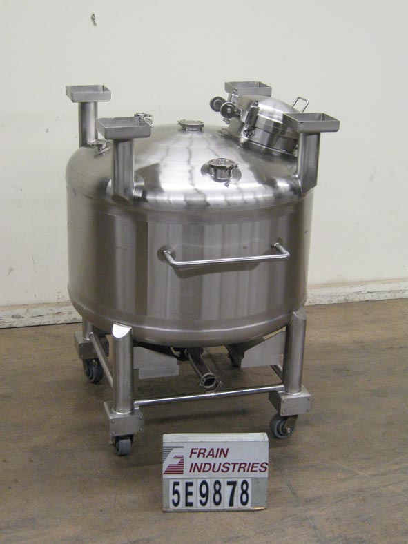 返回所有设备Seitz不锈钢,1000升(264加仑),316不锈钢,转移罐。内部尺寸:54“直径X 27”直壁。内部压力额定值:75 psi @ 284°F,全真空额定值:-20°F @ 75 psi。配有圆顶顶部,16英寸的直径男性方式与螺栓盖板,三个1-1 / 2“三星连接,两个4”三星连接,两侧安装的推拉手柄,3英寸冲洗式中心底部用手工曲柄隔膜阀放电。室内装饰:.240砂砾。外观饰面:装有叉车跑步者和锁定脚轮上可堆叠不锈钢框架上的140颗砂砾。