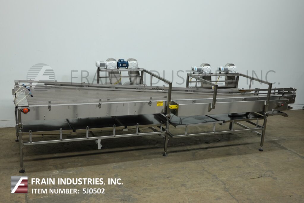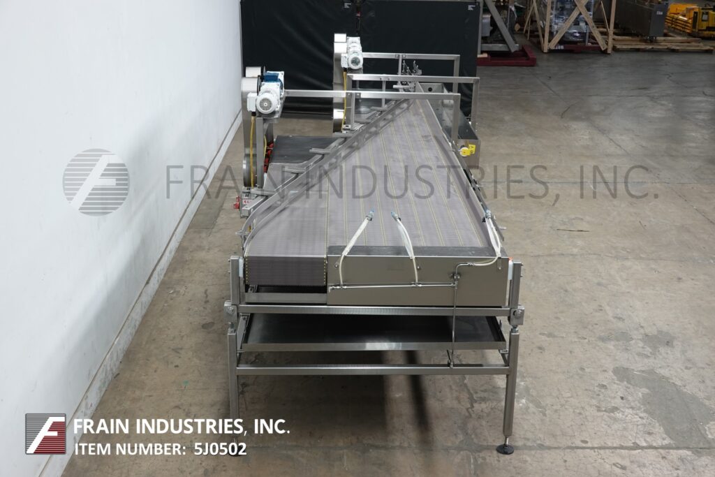 Back to All EquipmentSentry, stainless steel pressureless combiner conveyor. Equipped with 17¾" wide infeed conveyor, (2) 4½" Wide x 108" Long, (6) 4½" Wide x 200" Long lining conveyors and (1) 4½" wide discharge conveyor.