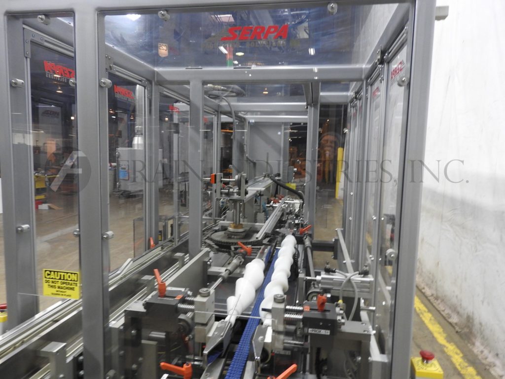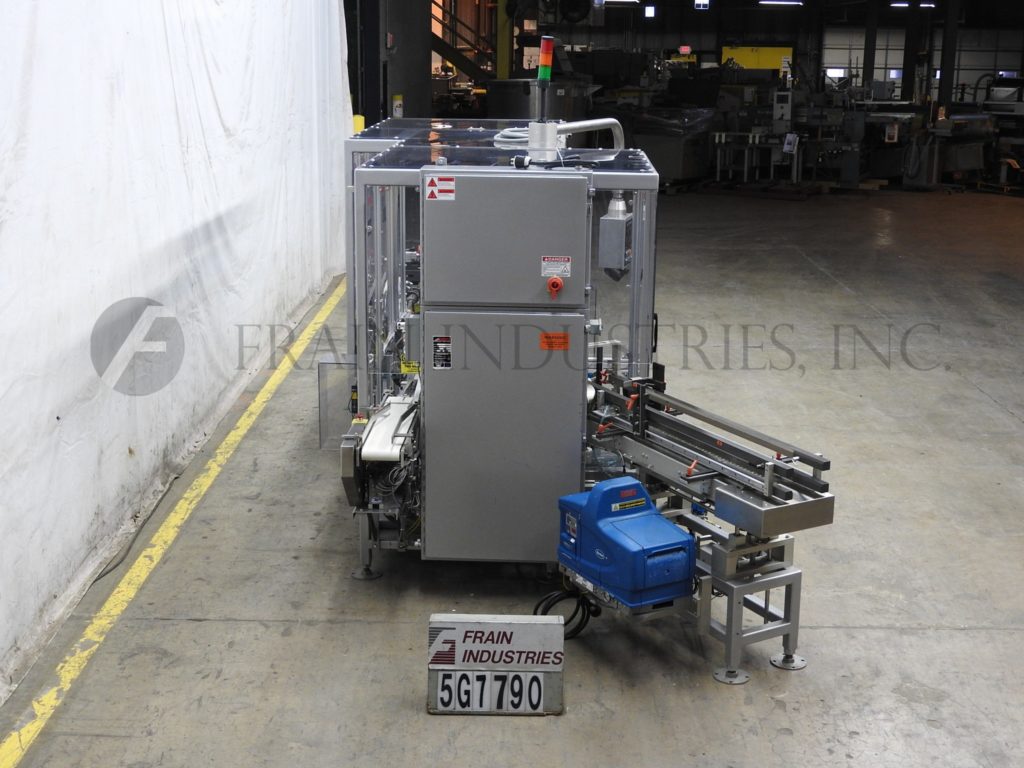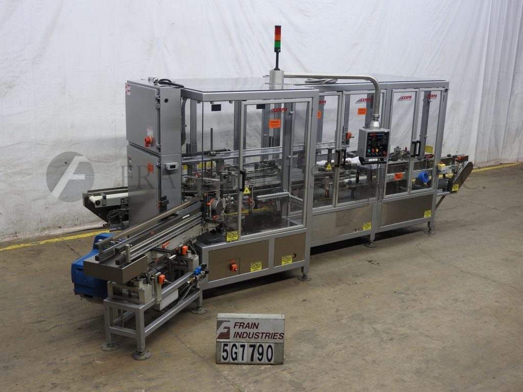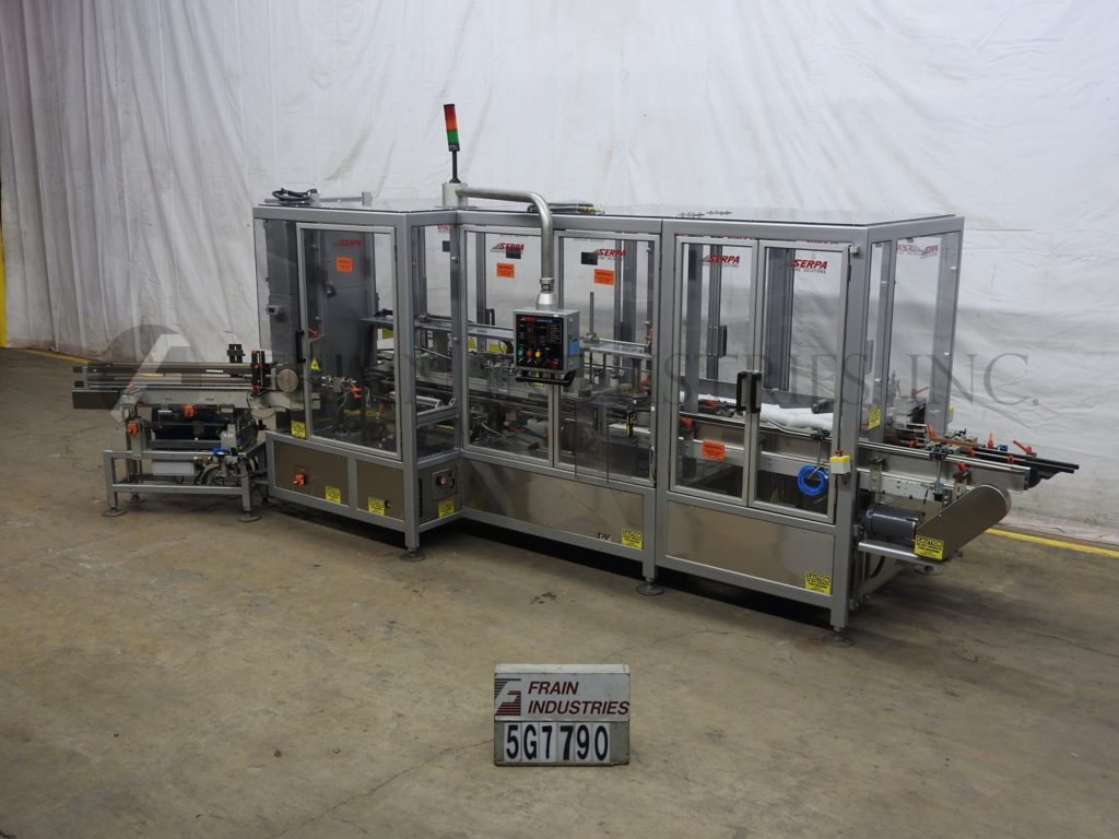 返回所有设备SERPA,型号2000VCM,半自动,连续运动,垂直,热熔胶盒装。每分钟40到70纸盒 - 取决于应用材料和应用。(2)当前设置在9“中心的可链可调单元。纸箱尺寸范围:1”至6“的长度;¾”到3½“的宽度; 3英寸至8英寸”深度 - 具有适当的变化部件。配备了55“长时间的空白纸箱杂志,(2)头吸盘旋转真空镐,吸盘盒预断裂,底部密封部分至4½”宽x 84“长氯丁橡胶转印带手动装载面积,2”宽X 86“长内克拉内传送带从手动装载区域到顶部密封件,带有(2)蜗杆螺丝馈线和6½”宽x 38“长氯丁橡胶排放带。Nordson Pro Blue Hot Melt胶水系统和互锁安全保护状态灯条。控制面板具有带触摸板可编程控制的A / B控制器,可变拨盘,真空接通/关闭开关,驱动反向/正向开关,驱动器运行/慢跑开关和启动/停止/重置/ e-stop按钮控件。安装在不锈钢底座上。