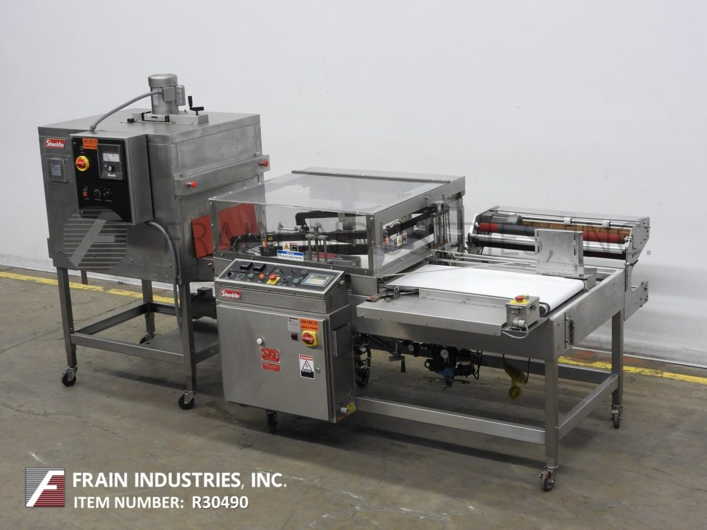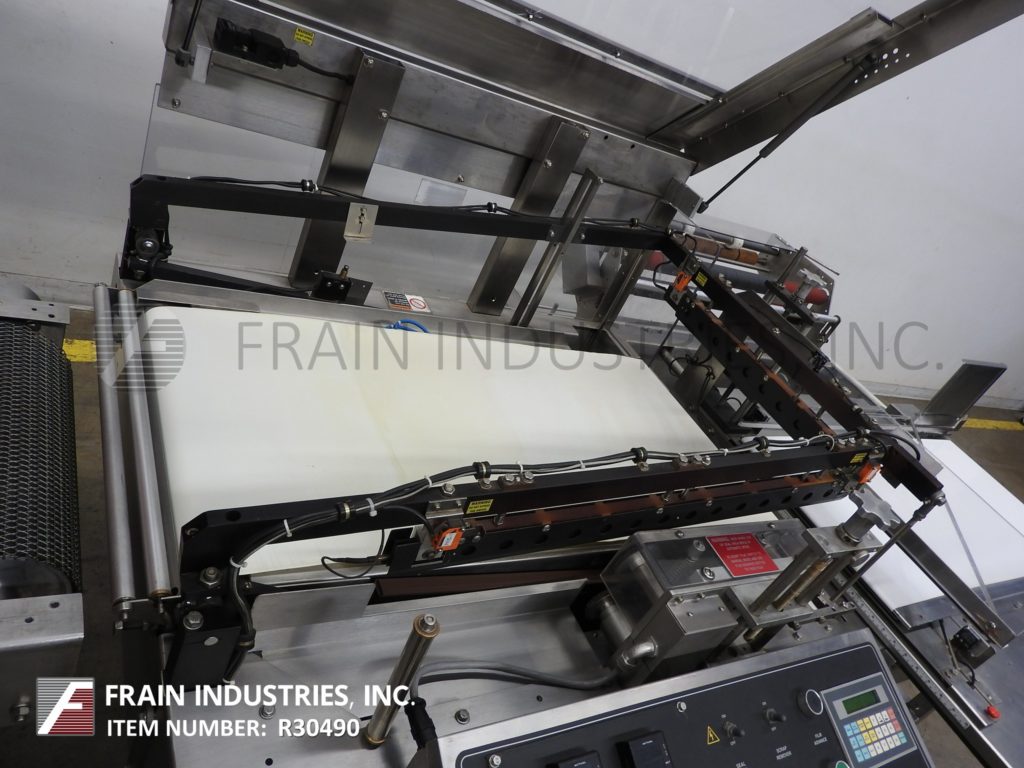 返回所有设备Shanklin, A27A型,自动,不锈钢,l -棒封口机和收缩隧道额定从10至25包每分钟-取决于材料和应用。包装尺寸范围:2¾“至33”长度;宽度为21英寸;到8英寸的高度。配备36"长x 17½"宽的饲料输送机和40"长x 19½"宽的产品通过密封区域和排放输送机。侧面安装膜辊与最大中心折叠膜26英寸的宽度和动力膜辊穿孔销轮。前膜和28“长x 19”宽L-bar与热刀密封钳。控制面板有A/B控制器与触摸板控制和读出,A/B变速控制器,与启动,停止,手动,复位,前和十字密封热控制,传送带速度拨号,废料清除控制与e-stops。安装在不锈钢框架上,带有翻转式安全保护和锁紧脚轮