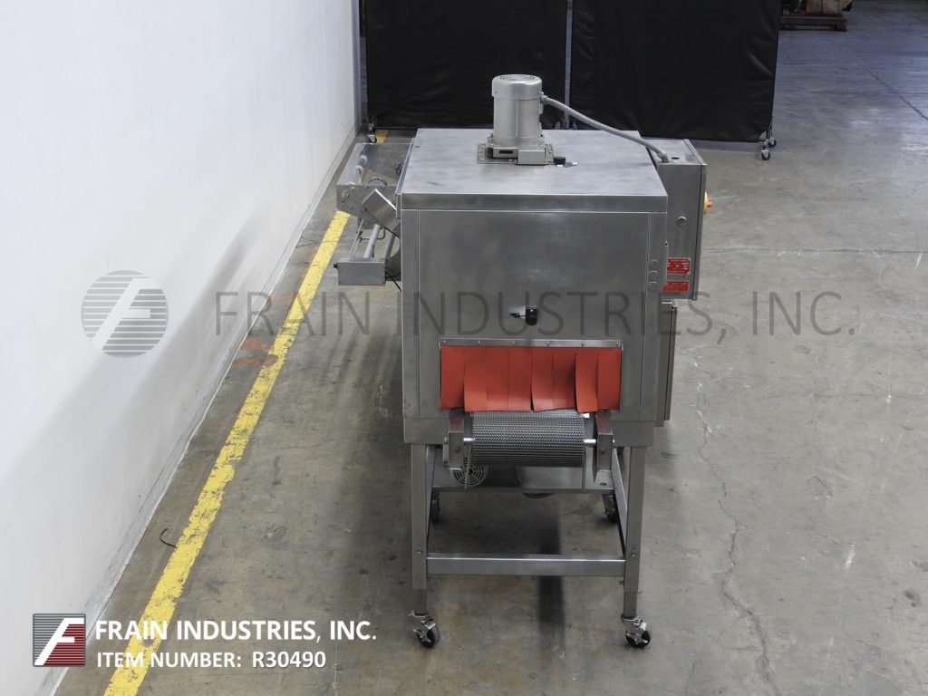 Shanklin, T-7XL型,不锈钢,自动单区收缩通道,每分钟产品数量取决于材料和应用22”宽。隧道:42英寸长。配备15"宽x 58"长钢网带,顶部安装鼓风机电机和底部输送加热器。控制面板有温度控制器范围50°F至500°F,开/关热开关和输送速度控制拨号。安装在带有脚轮的(4)腿基础框架上。