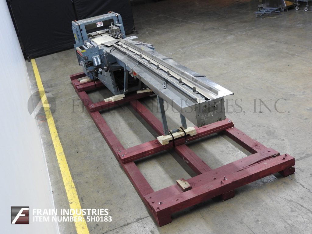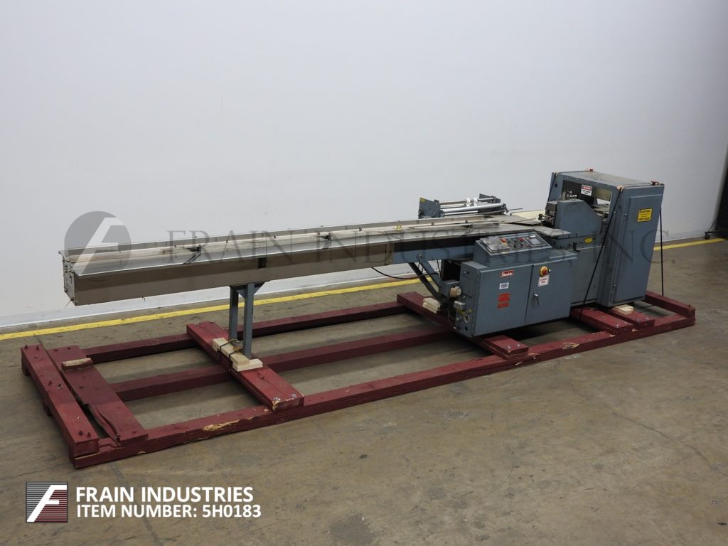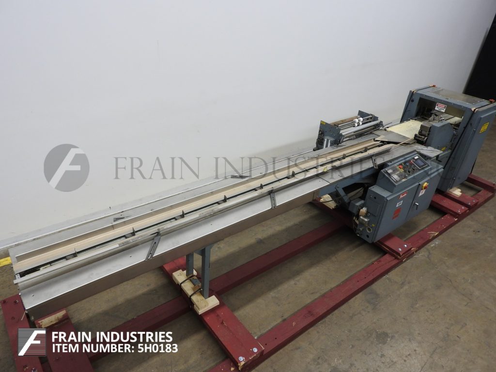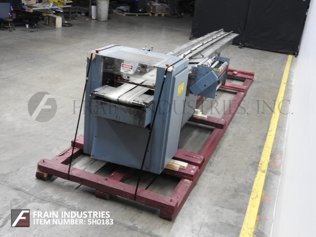 返回所有设备Shanklin,F-5AH型,水平流经收缩包装。额定值为0至90线性英尺/分钟,产品数量取决于材料、应用和机器配置。包装尺寸范围:3英寸至48英寸长;½英寸至16英寸宽;高度为1/8英寸至6英寸。配备144“长牵引产品进料输送机,位于15”中心,配备2“高x 1½”宽凸耳、15“宽x 24”长传送输送机、(2)5½”宽x 32”长卸料输送机、25“预折叠侧膜展开、9”长侧密封和18”宽热线端密封。控制面板具有A/B PLC控制器、触摸屏显示器、启动/停止/循环/紧急停止按钮、用于侧密封加热、端密封加热和主驱动的可变刻度盘。