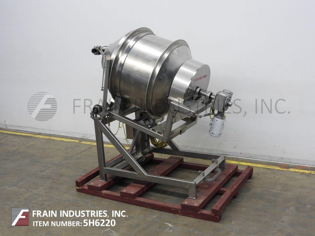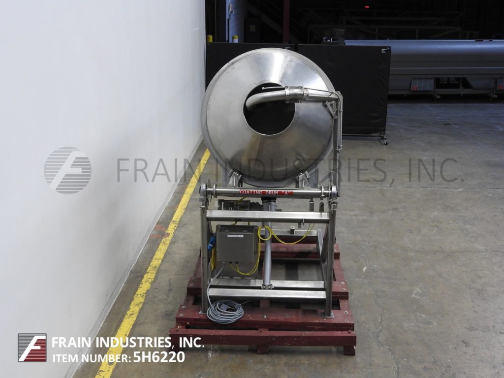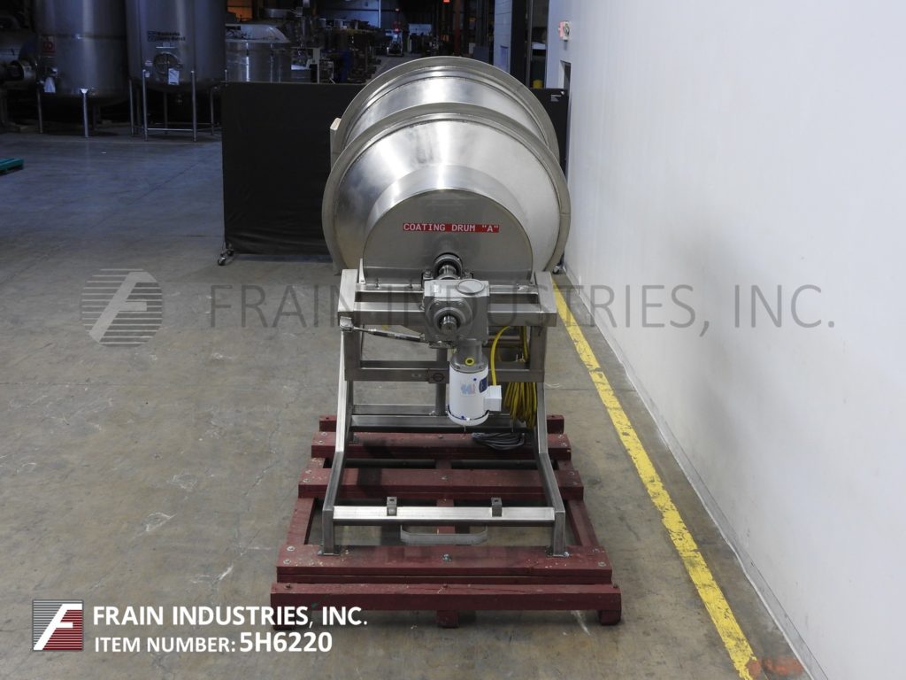 返回所有设备应当,42“ID,304不锈钢,鼓形涂层平底锅,每小时具有磅的产品 - 取决于材料的应用和操作员灵活性。泛尺寸:42”ID;50“深度。配备16”OD产品端口,带64“电荷高度,(6)固定挡板,2HP鼓电机驱动和倾斜放电,由1½HP驱动器提供动力。安装在带有脚轮的不锈钢基础框架上