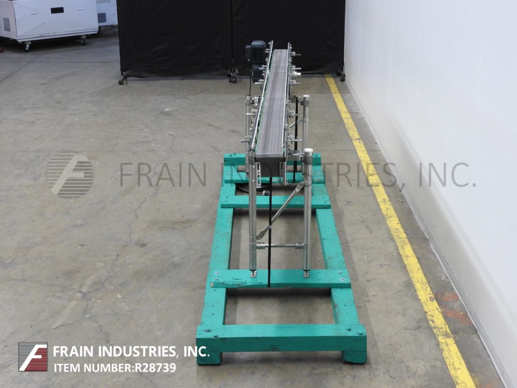 侧面,不锈钢台面输送机。6英寸宽和142英寸长Intralox风格腰带。进料和出料高度为47”。配备3 / 4马力驱动和可调节滑道。