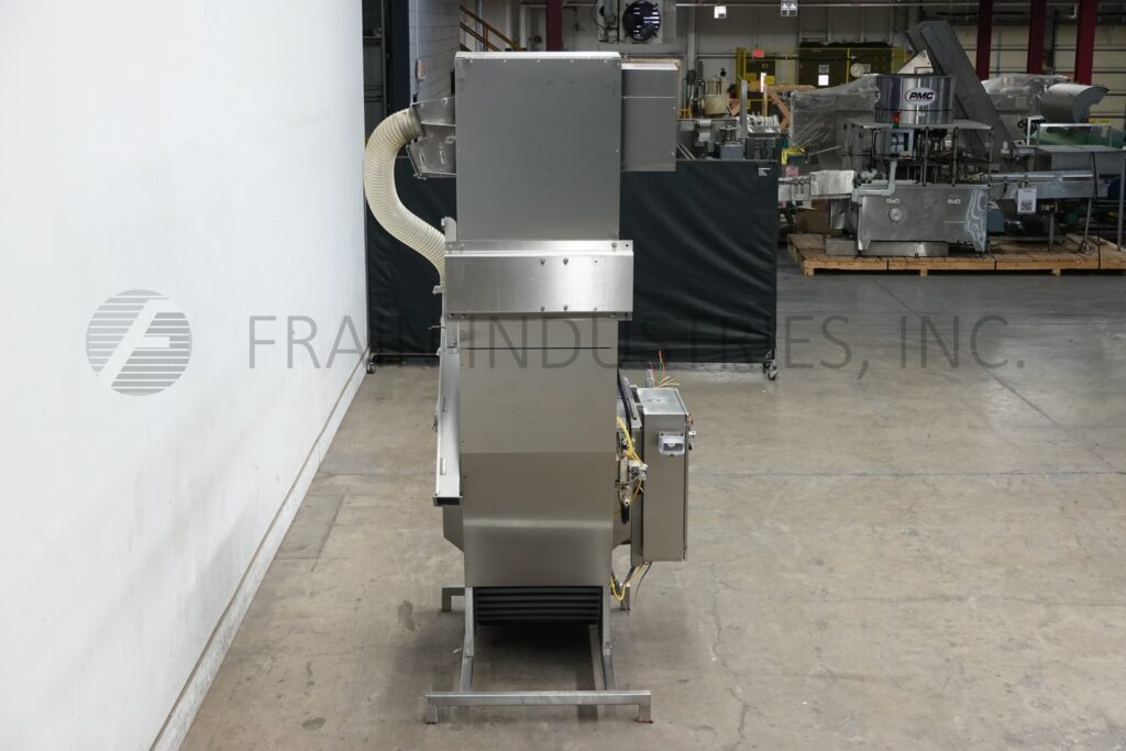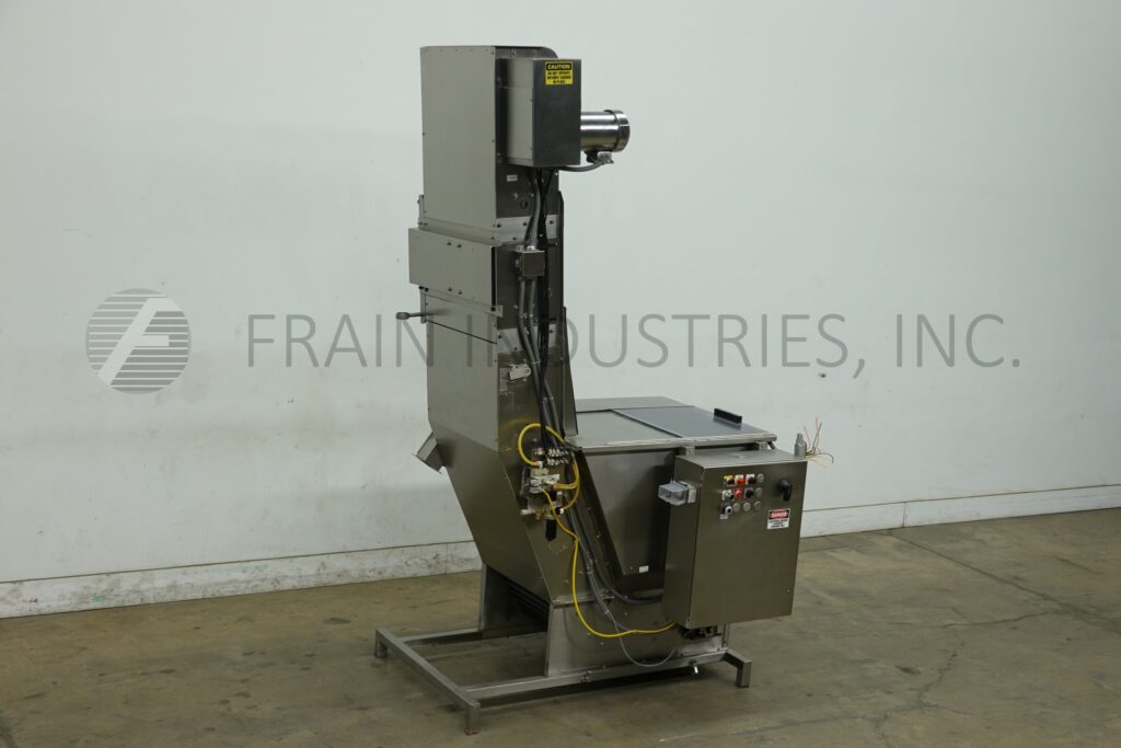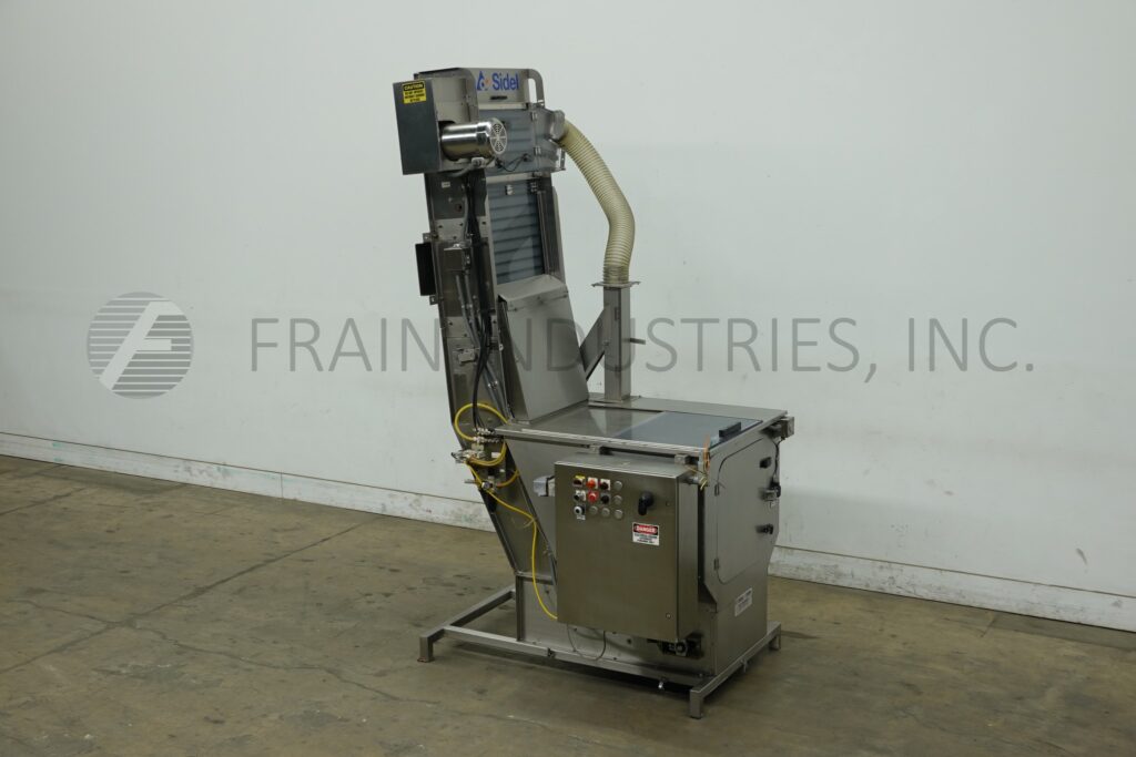 Back to All EquipmentSidel / Aidlin, Automatic, stainless steel, cap feeder and orientor rated up to 1800 caps per minute – depending on materials and application. Cap size range: 20mm to 120mm. Equipped with 40" long x 36" wide x 44" deep product hopper, 120" long x 24" wide incline flexlink cleated conveyor with 1/2" high cleats set on 3" centers and discharge chute with 118" discharge height has control panel with variable speed control dial and start, stop, e-stop push buttons controls. Mounted on a stainless steel frame with height adjustable legs.