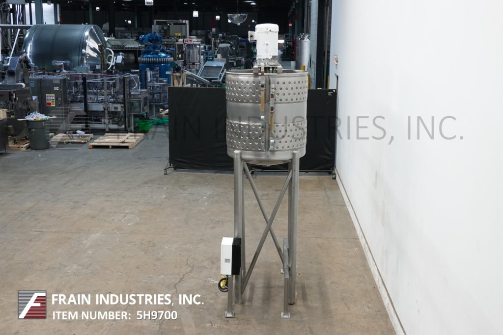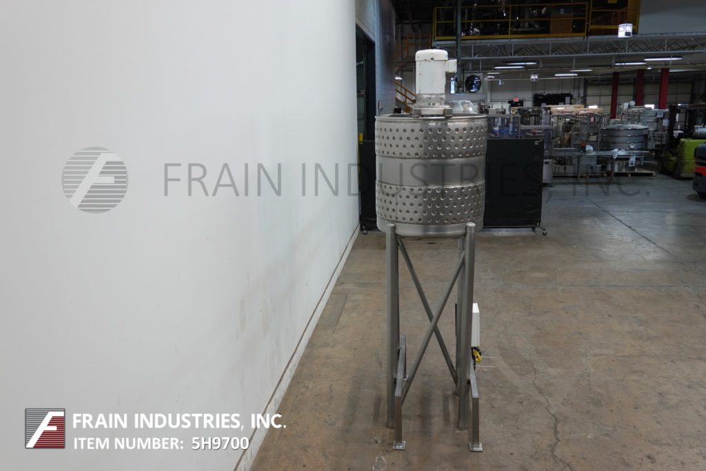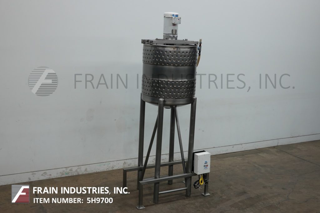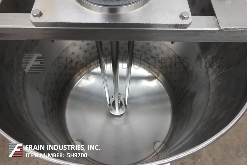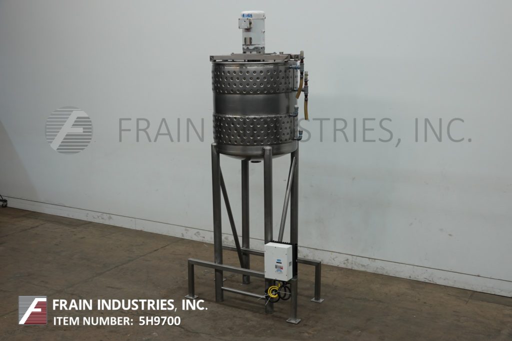 返回所有设备150加仑容量,304不锈钢,低压夹套工艺罐。容器尺寸:35“外径x 42”深36“直壁。配备桥式Silverson型号FX60高剪切混合乳化剂,由7½马力驱动,变速控制。安装在(4)腿不锈钢框架4½“外径/ 4”ID三夹底部放电62“地间隙。