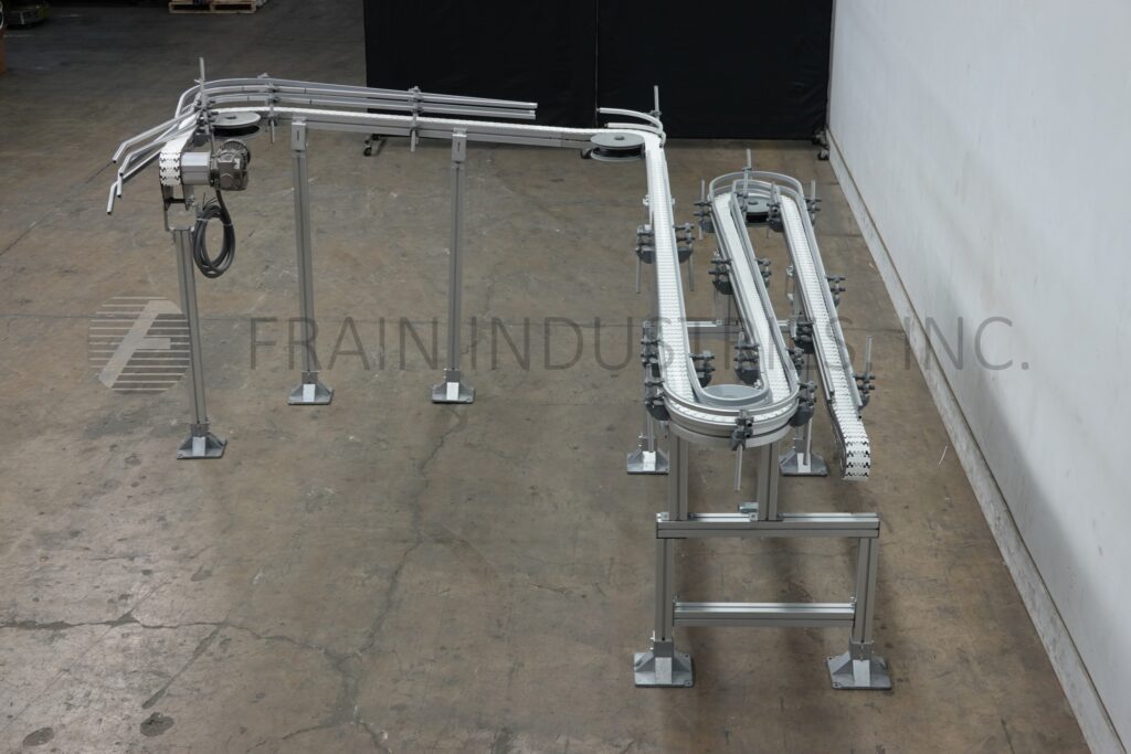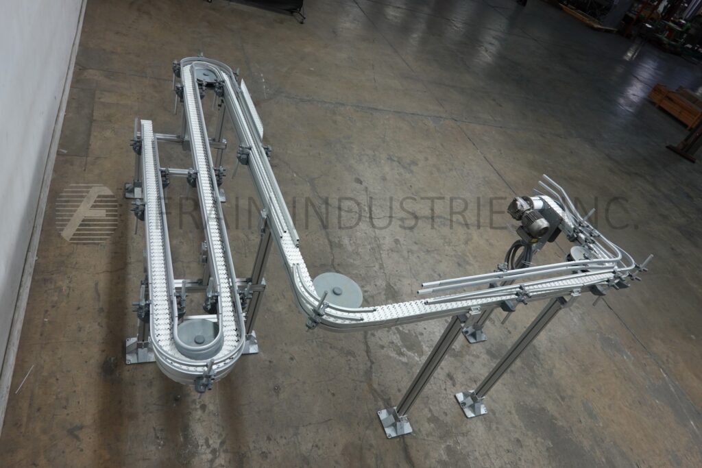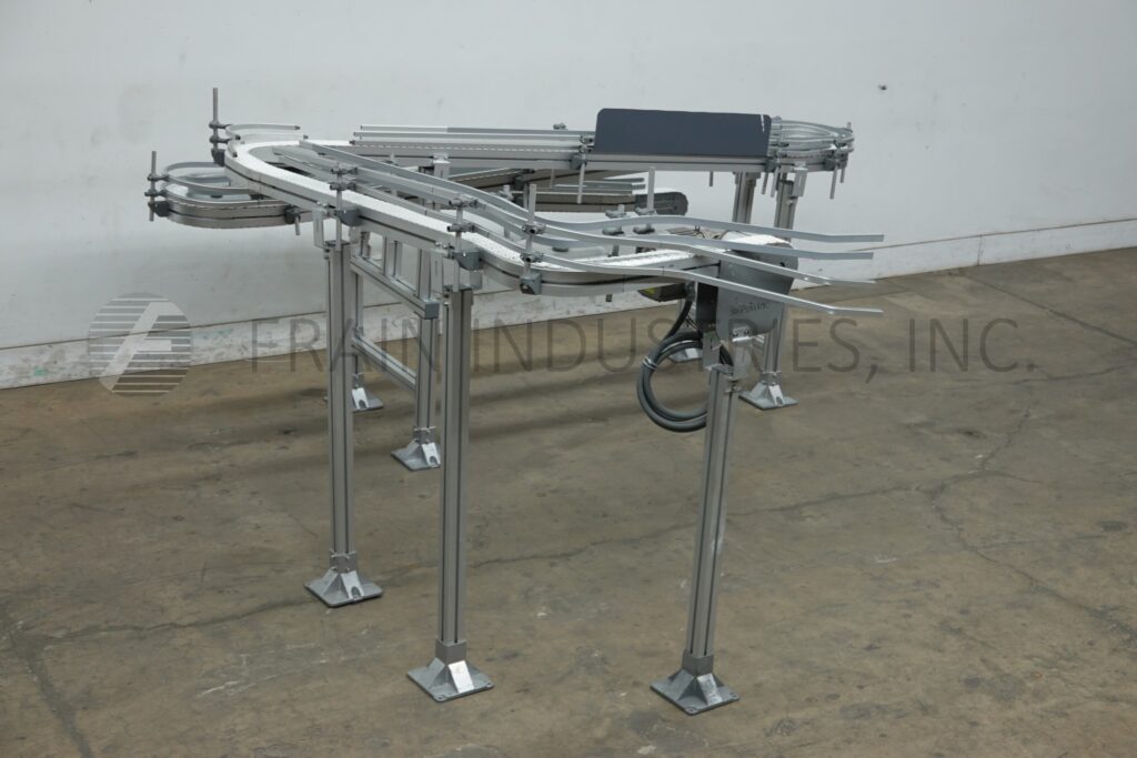 Back to All EquipmentSimplematic, 3" wide x 430" long table top switchback conveyor with adjustable guide rails. Has 25" in feed height and 60" discharge height. Mounted on (4) leg with leveling pads.