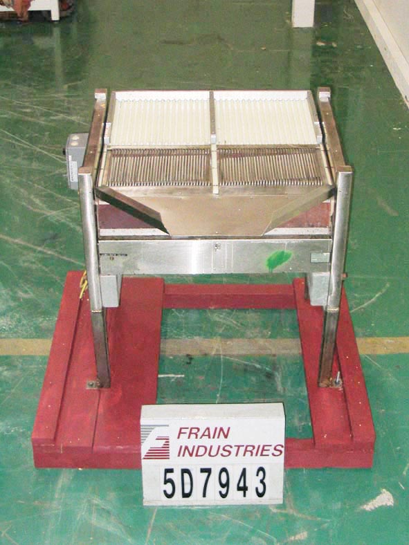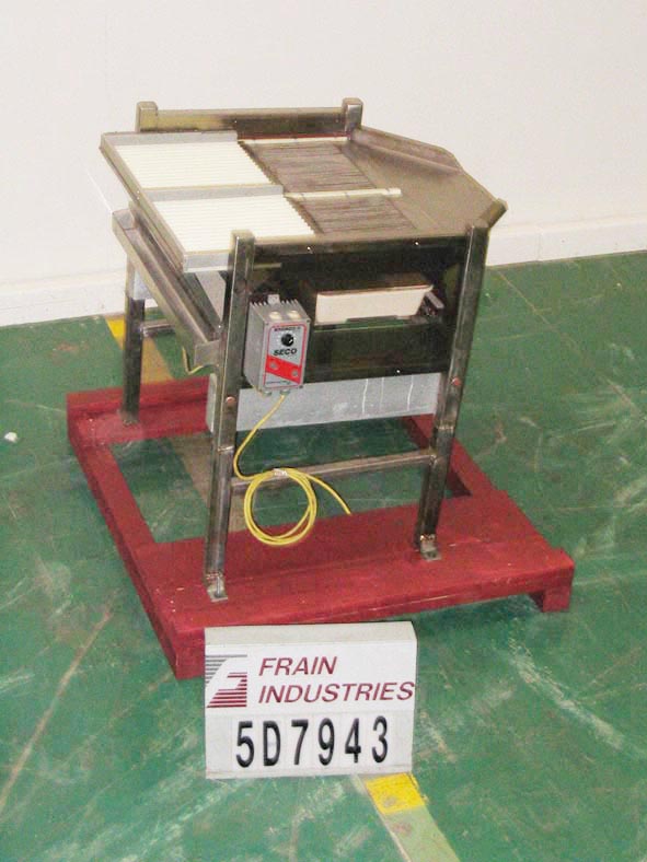 返回所有设备在线、S/S、振动式产品分拣机。配备两个16英寸宽的进料装置、一个11英寸长x 31-1/2英寸宽的分拣区、12英寸宽x 36英寸高出料装置和两个可拆卸的缺陷收集托盘。配备SECO直流驱动器、lexan防护装置。由MagneTek 1/4hp电机供电。目前设置为拒收1/8”及以下的产品。
