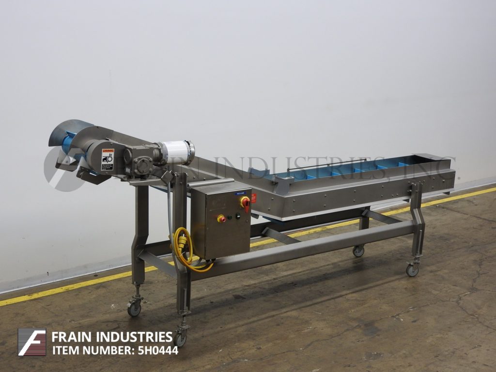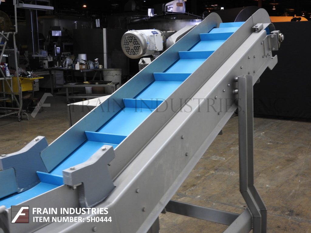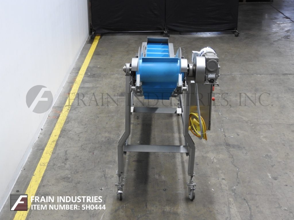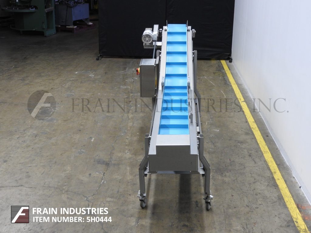 返回所有设备Smalley,不锈钢,倾斜夹紧进料输送机。配备了16英寸宽的食品级带,2“高夹板,在12”中心,38“至47”高饲料,82英寸“长横向运行,70”长倾斜,61英寸至70“放电范围。供电通过具有变速控制的½HP驱动器,并安装在带有脚轮的不锈钢(4)腿基架上。