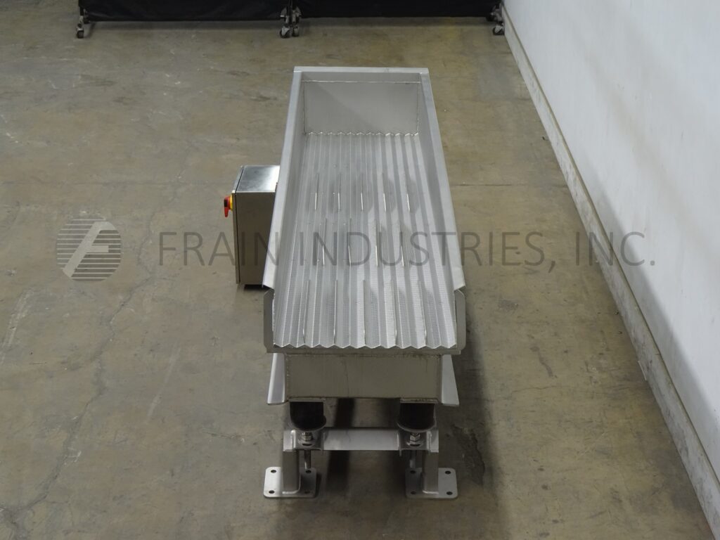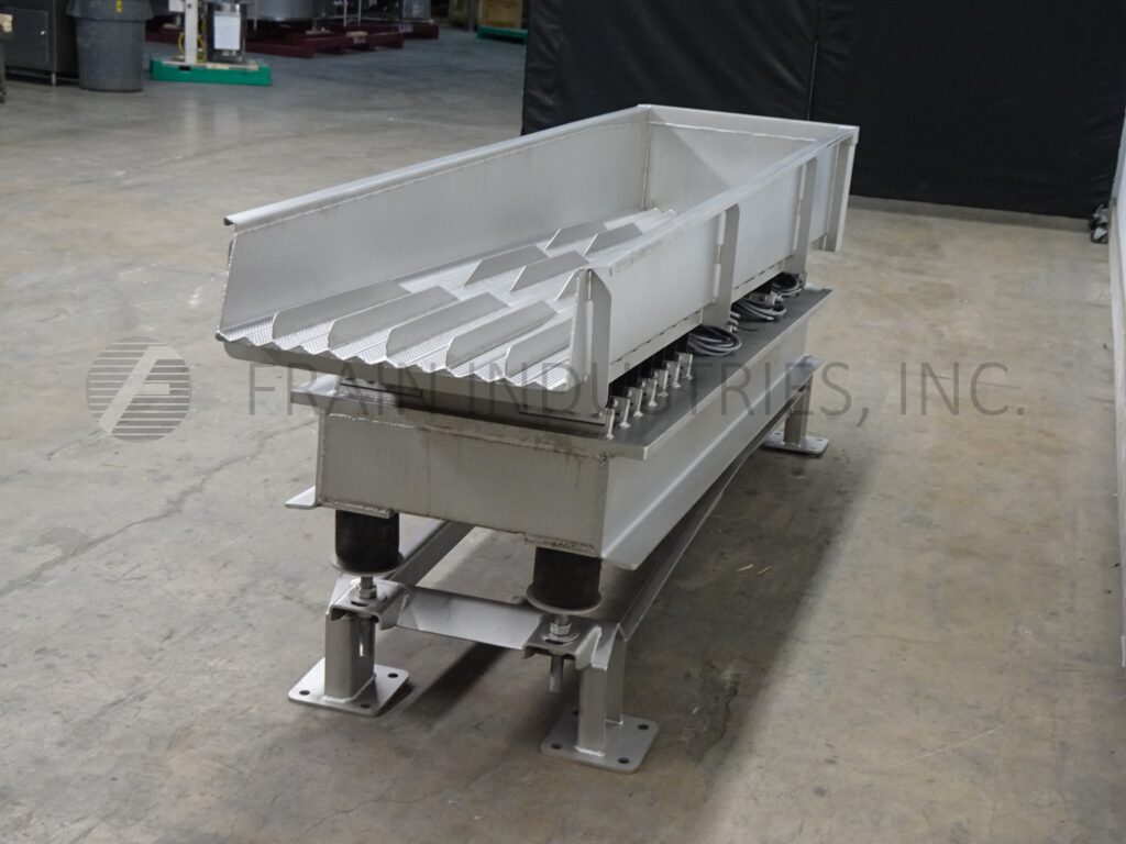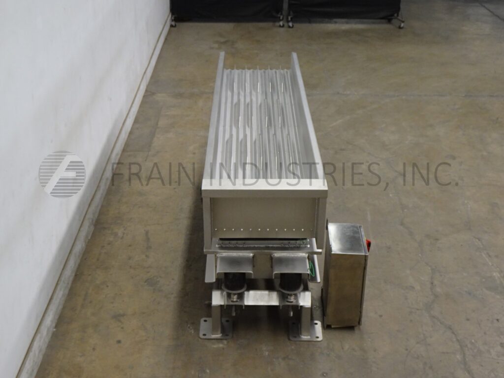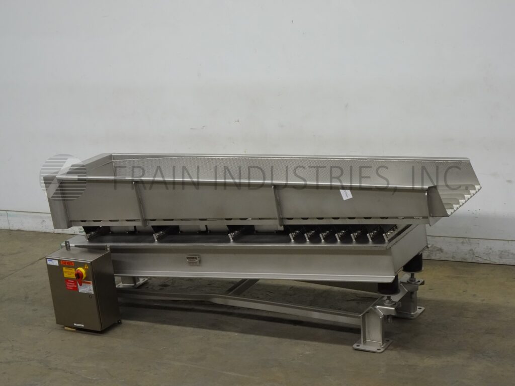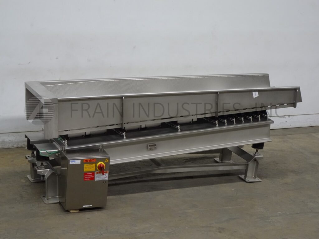 SmalleyMfg公司、不锈钢公司、槽式电文传送器,配有12条产品通道和2条宽槽,每小时产品量取决于材料和应用配有24"宽x112"长传送床 并有12'高填充侧墙/7'高排泄侧墙搭载重值不锈钢架