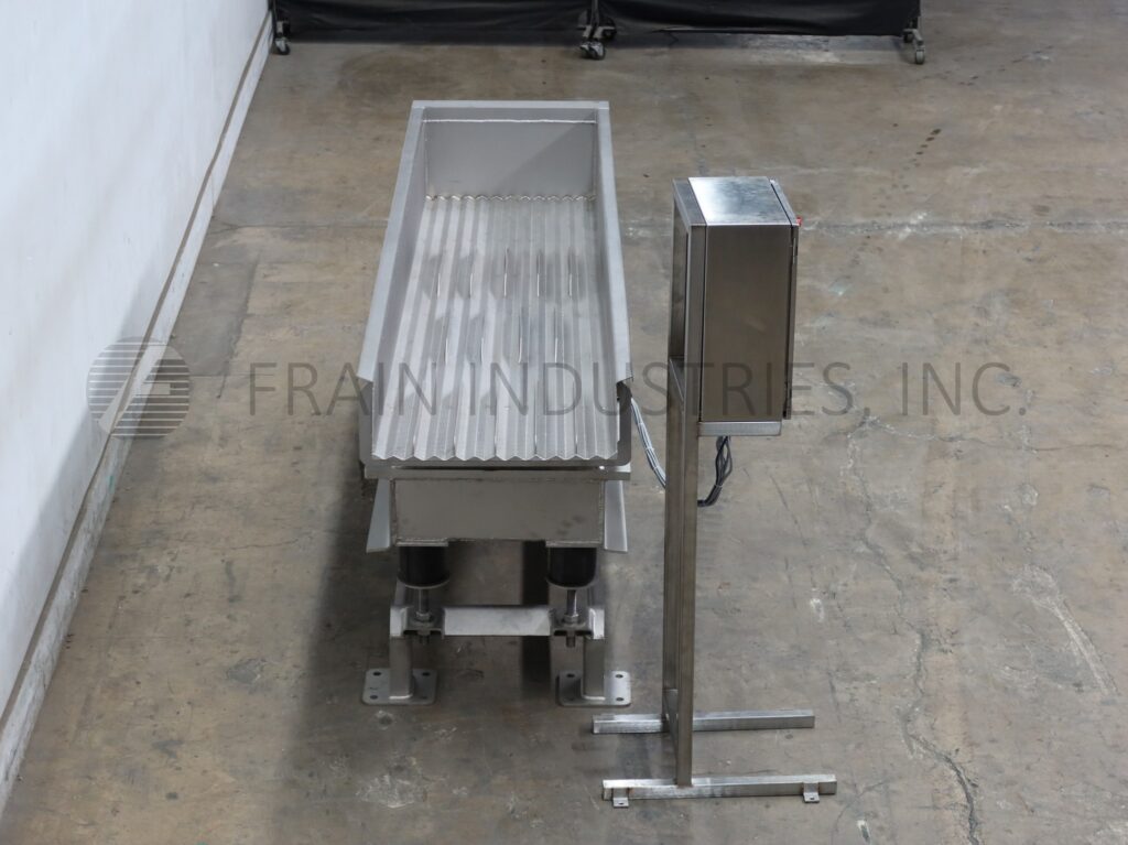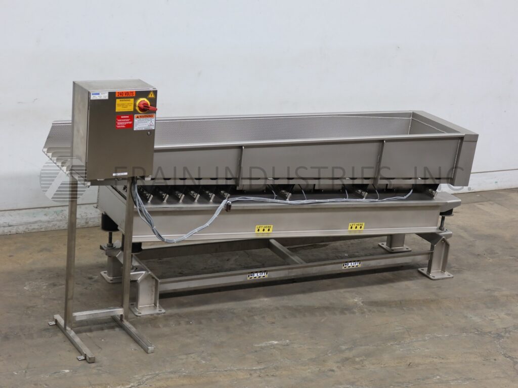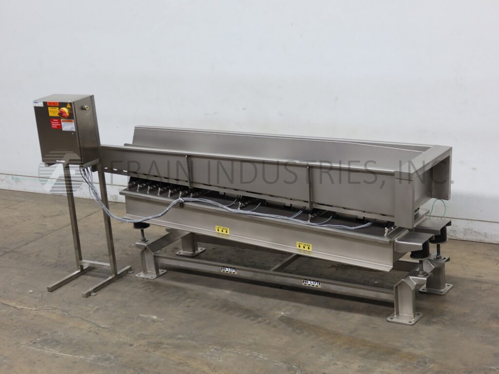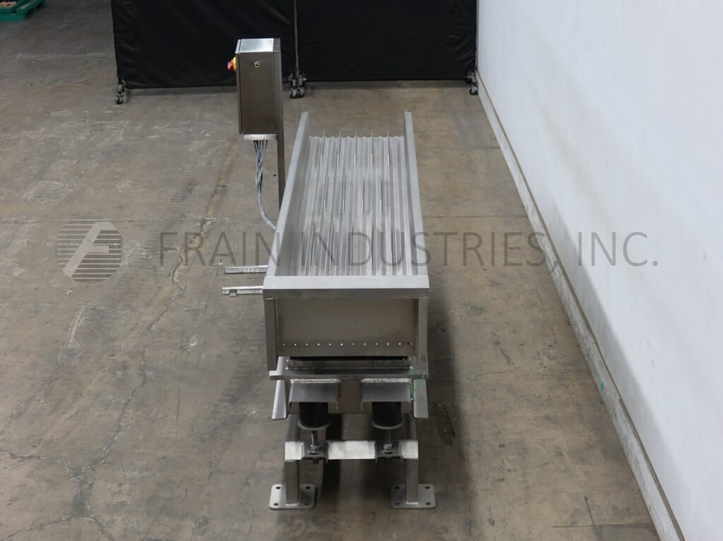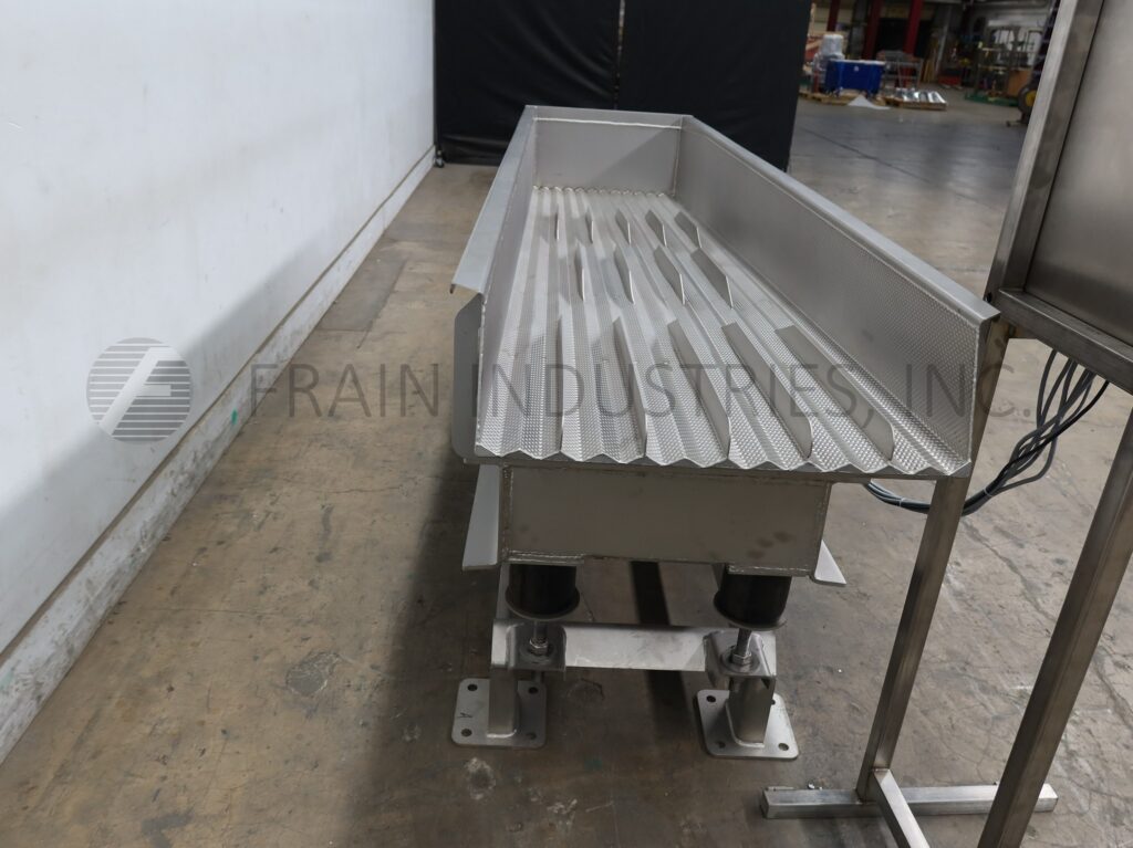 SmalleyMfg公司、不锈钢公司、槽式电文传送器,配有12条产品通道和2条宽槽,每小时产品量取决于材料和应用配有24"宽x112"长传送床 并有12'高填充侧墙/7'高排泄侧墙搭载重值不锈钢架