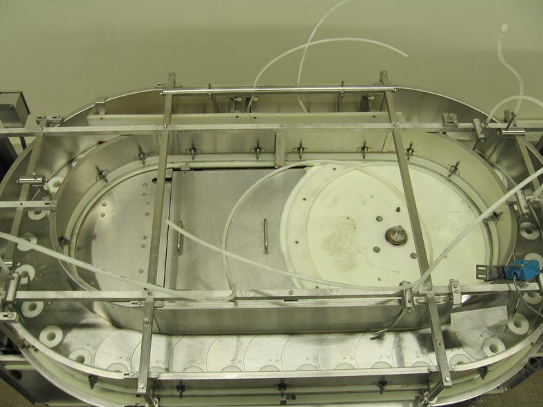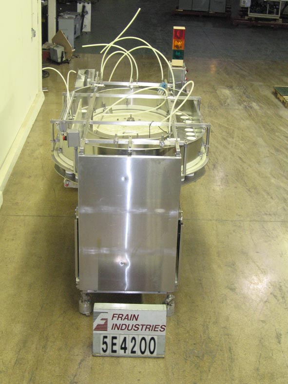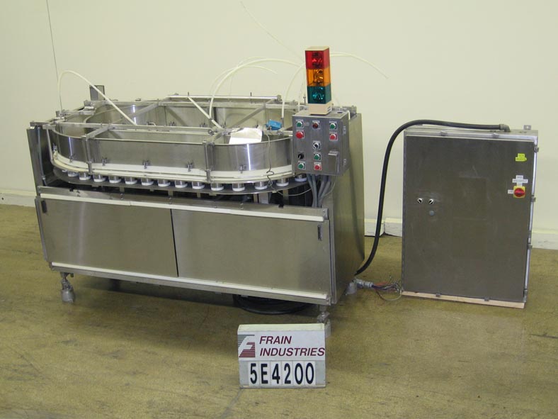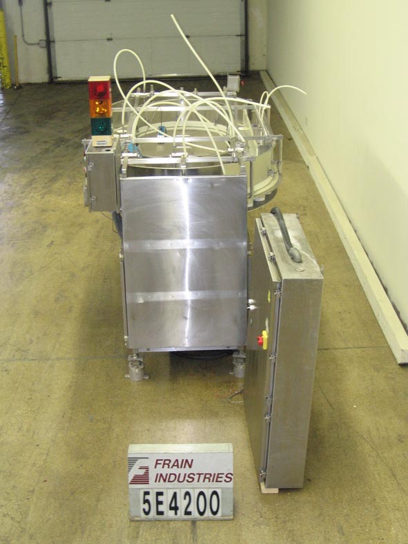 Back to All EquipmentSolbernModel PFDP, 40 Pocket rotary, continous motion, volumetric filler rated up to 400 containers per minute – depending on materials and application Volume of fill is determined by diameter and height of the product pockets (which are change parts) currently set with (40) 1-1/4" diameter x 4" deep product pockets. All stainless steel construction, Equipped with 54" L product worm screw container infeed, 4 pocket exposed product load area, with optional water nozzle product assist fill system (for stickier products) and level wipers. Remote control panel has PLC controller, with start, stop, jog, conveyor and volume control buttons with e-stop, and colored status light bar. Can handle products like diced meat, vegetables, fruits, grainulars, etc. Last filling 4-1/2 oz glass baby food jars with fruits, vegtables and meats at rates from 200 to 400 container per minute.