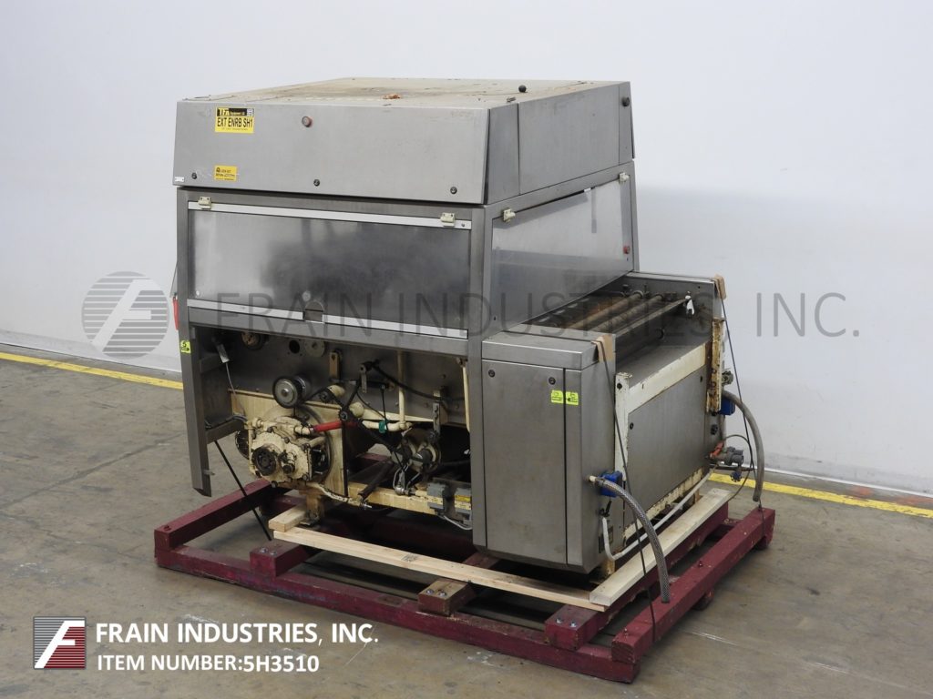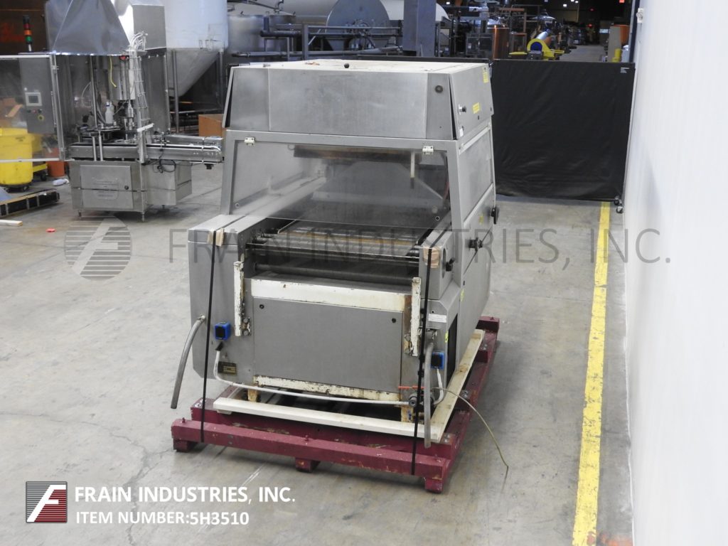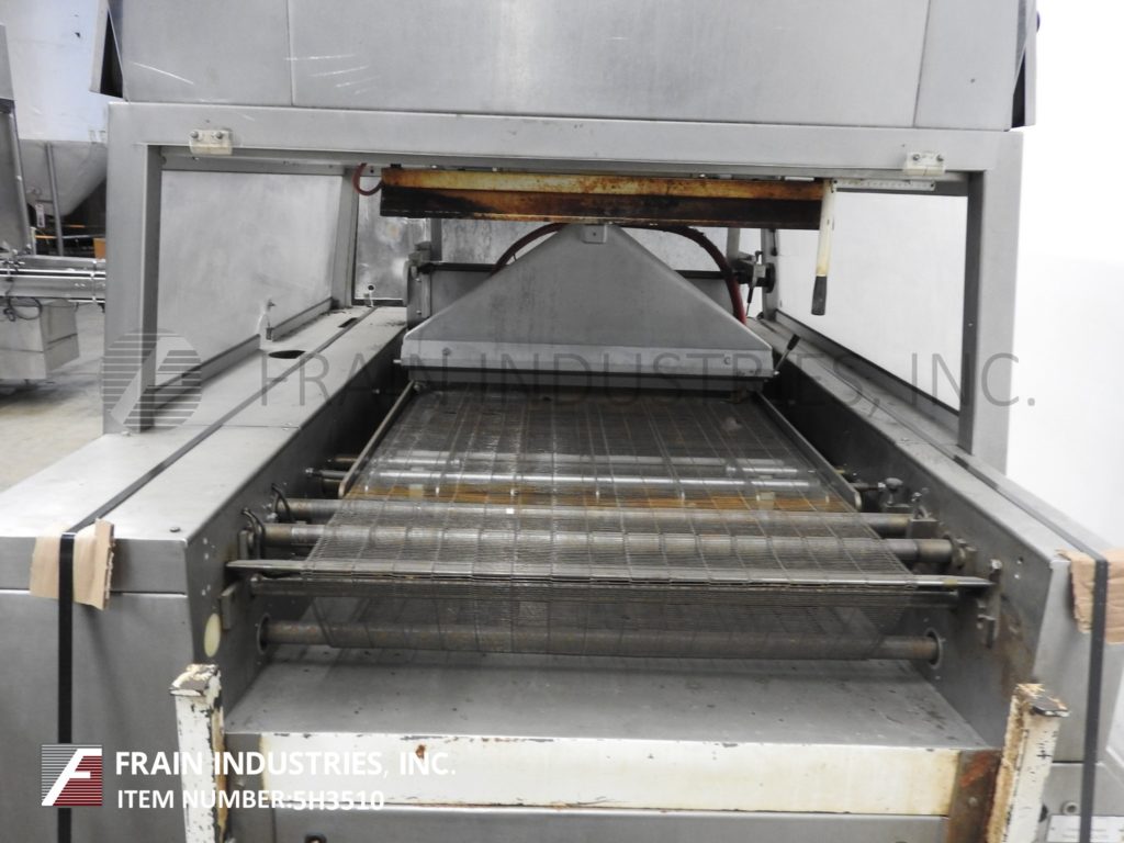 Cooling tunnel is (2) zone, stainless steel, air cooled, with 50" wide x 4¼" high aperture, (1) 840" long stainless steel cooling chamber and 40" wide x 848" long Neoprene conveyor belt with in feed / discharge height range of 38" to 43". Control panel has independent temperture controls for cooling tunnel zones and variable speed control for belt, start, stop and e-stop push buttons with on / off switches for defrost. Both mounted on stainlesss steel frames.