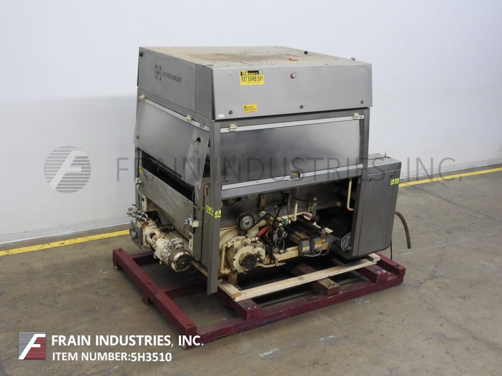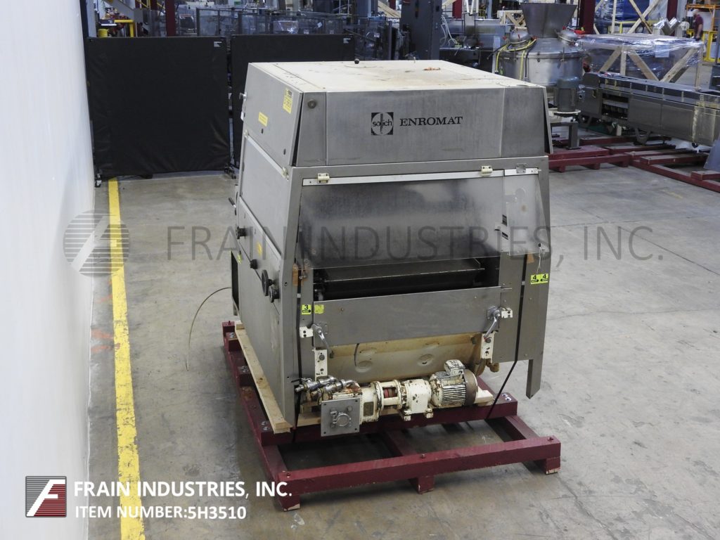 Back to All EquipmentSollichModel EMM-820, 32" wide, stainless steel top / bottom chocolate enrober and cooling tunnel with pounds of product per hour – depending on materials and application. Enrober equipped with 32" wide x 72" long wire mesh product conveyor that runs thru the length of the enrober, with 40" in feed and discharge height. Chocolate flow pan, blower, overhead heaters, air duct, detailer, shaker, chocolate supply port, product service pan, PD circulation pump, with flip-up safety doors and hand crank adjustable. Control panel has temperature controller with digital read out, belt speed, blower, top heating and light package, chocolate and supply pump controls with e-stop.