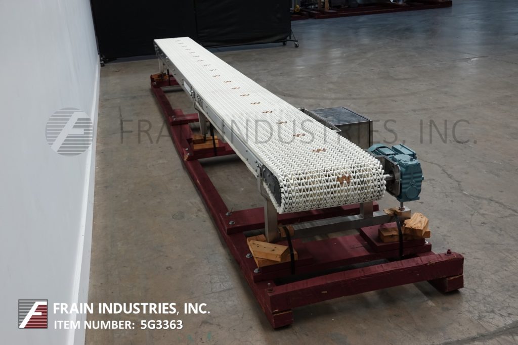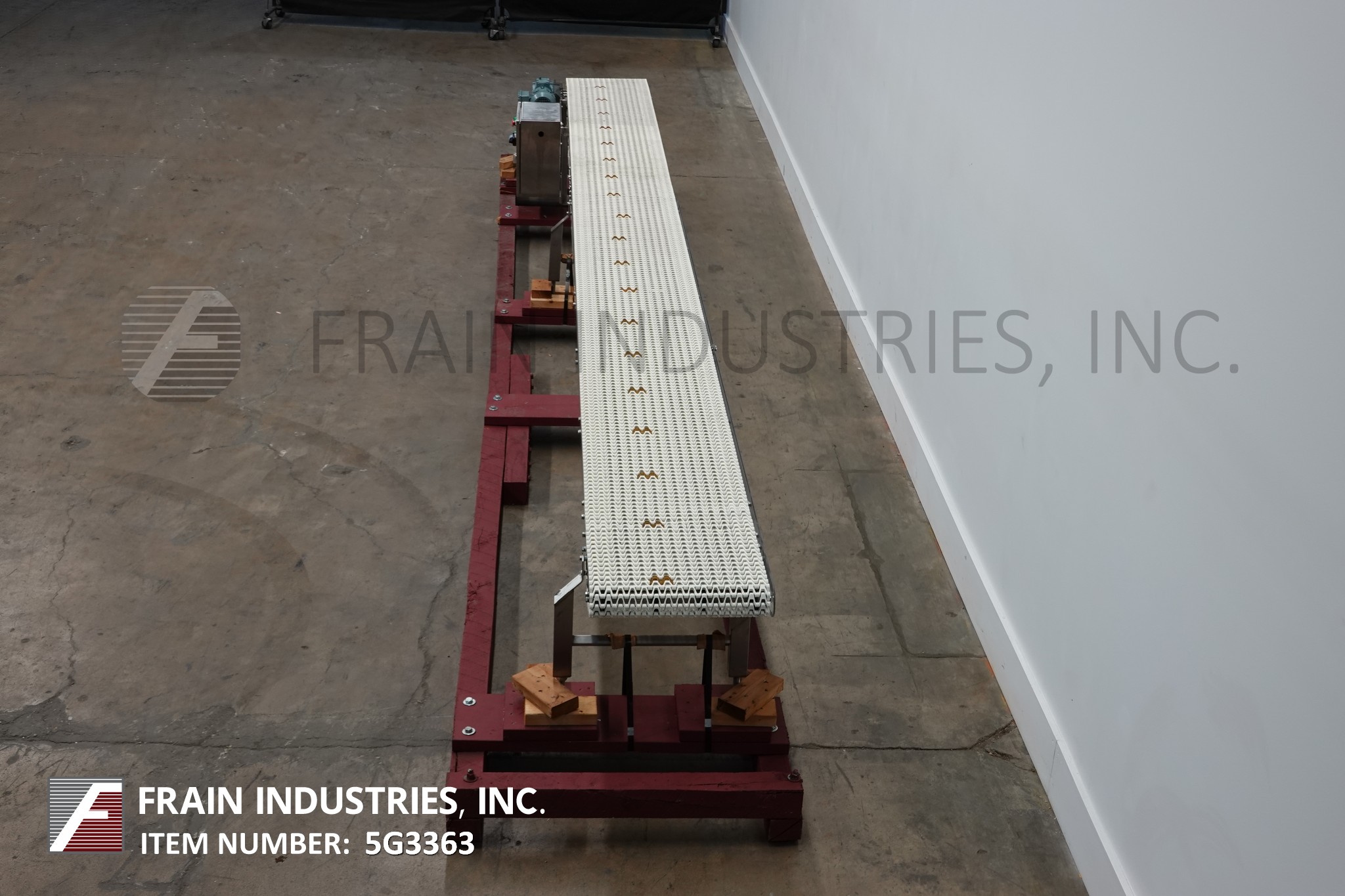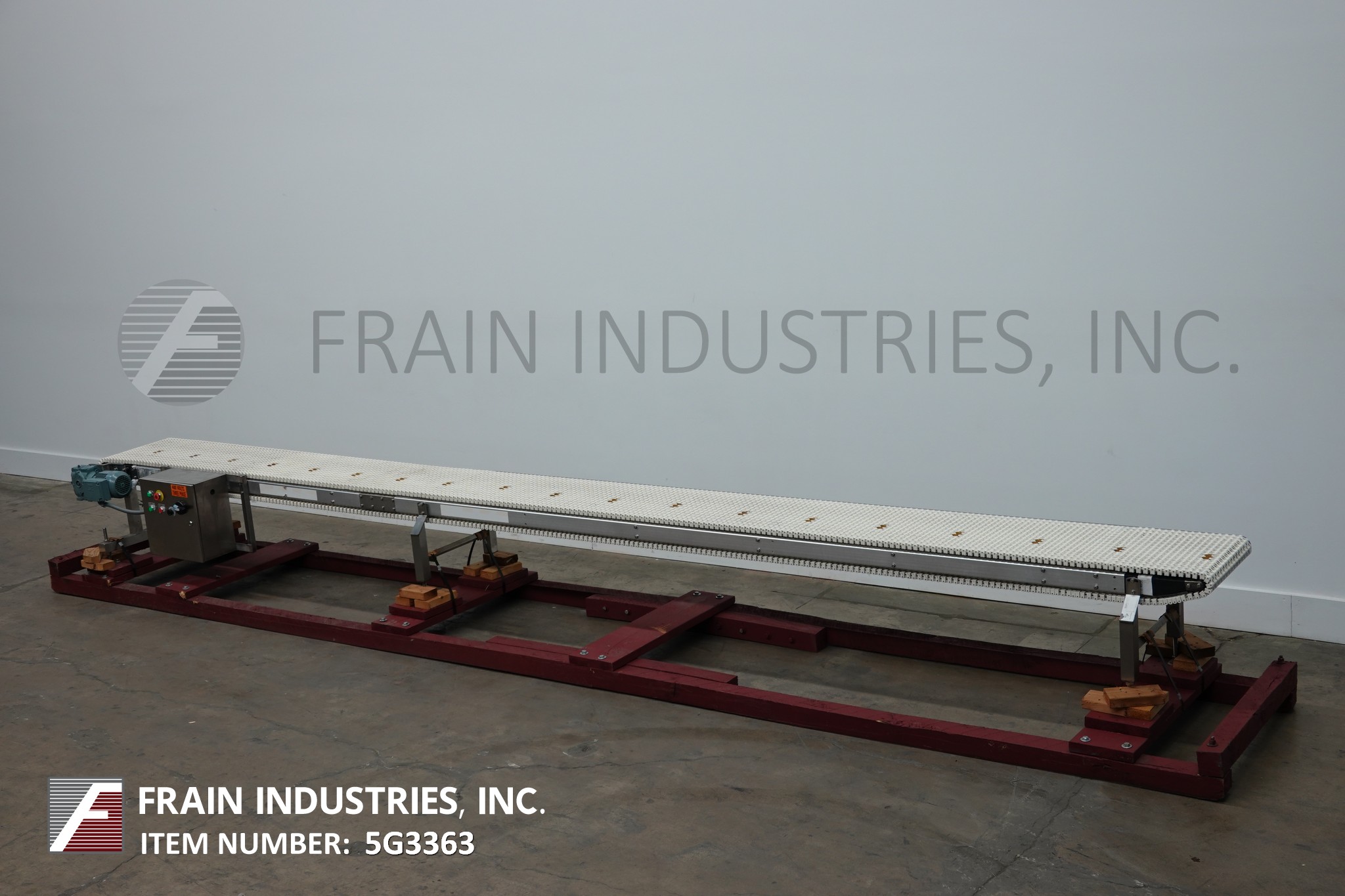 跨度技术,18"宽x 240"长,不锈钢,柔性链带输送机。配备1/2马力驱动和启停控制。安装在不锈钢支架上,支架高度可调。产品规格:240" L x 26" W x 20" H