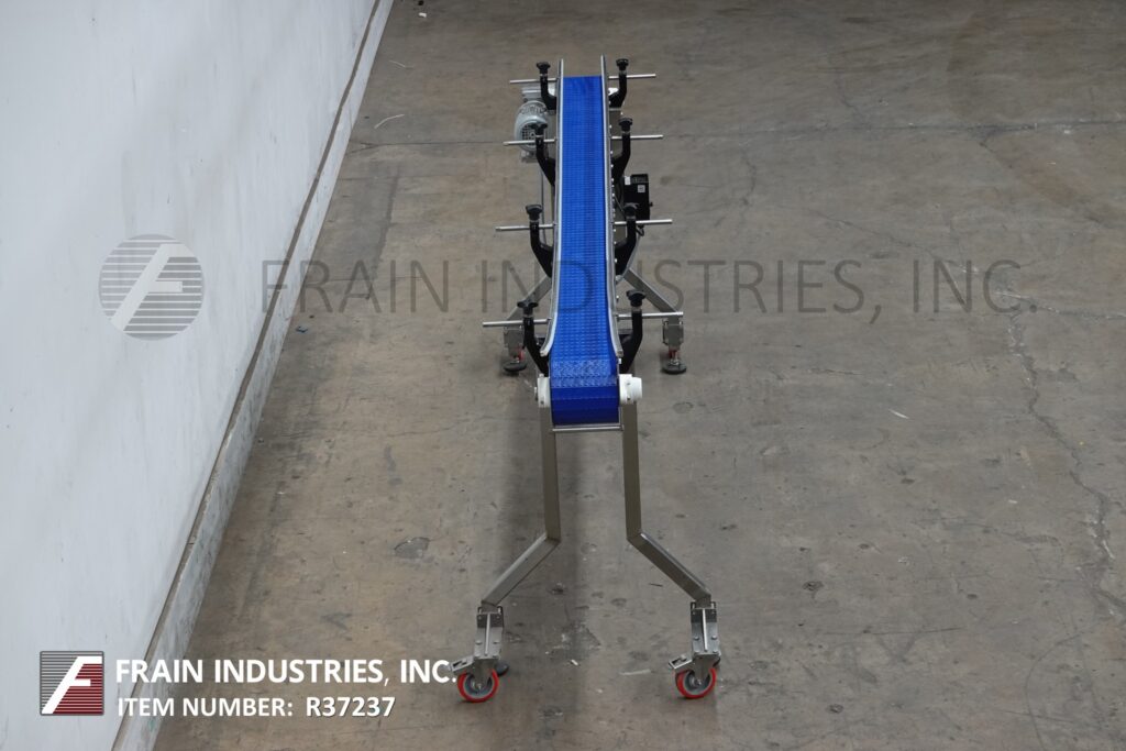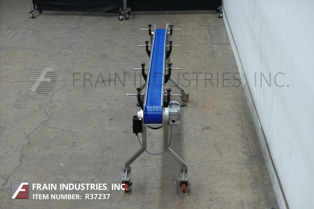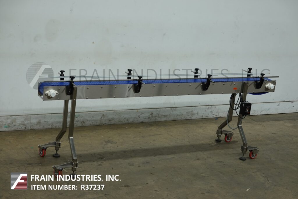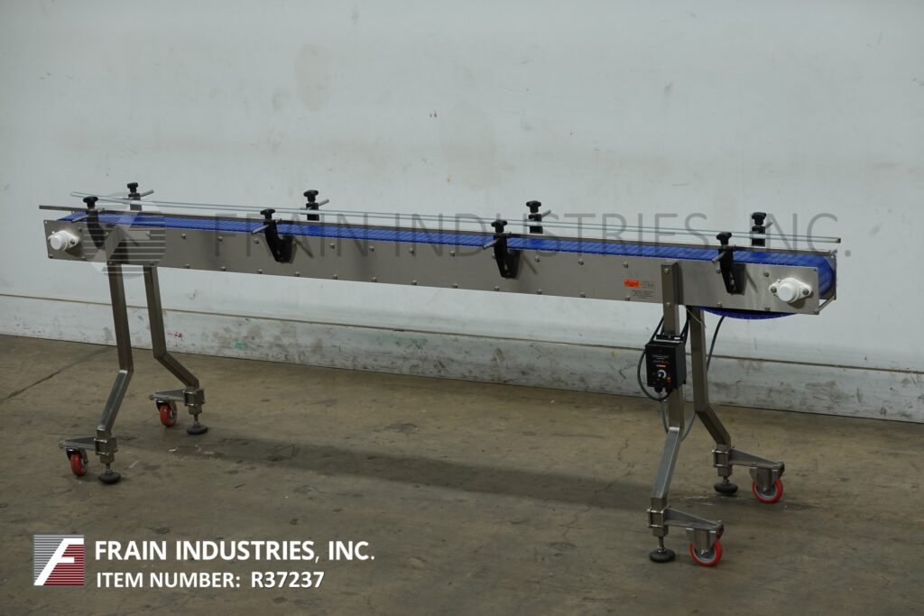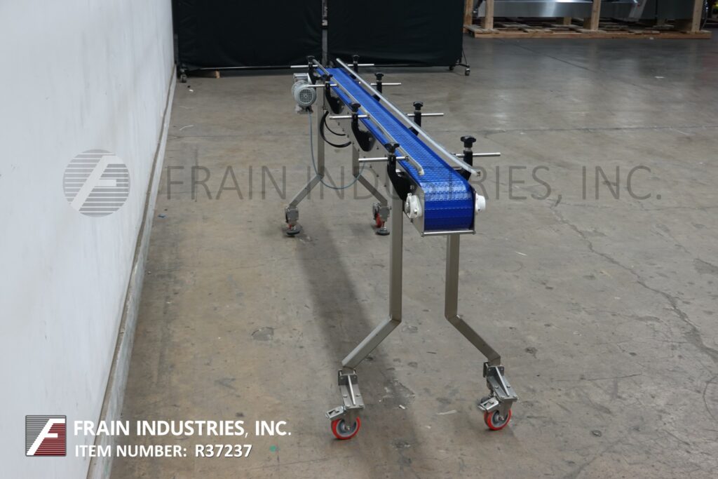 高速输送机,不锈钢框架台式输送机。配备6“宽x 110”长带与36“进料/出料高度,脚轮和变速控制器。