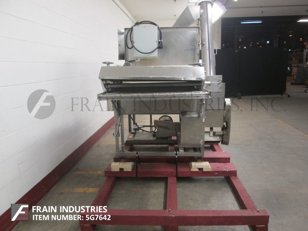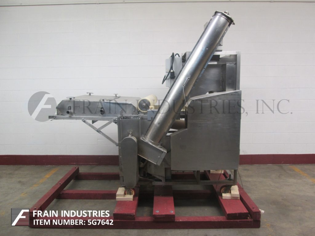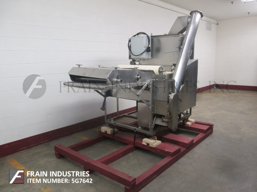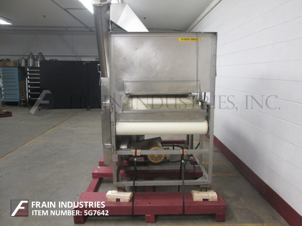 返回所有设备Stein模型遗产,自动不锈钢面包涂敷器每小时产品数量-取决于材料和应用。可输送面粉和细颗粒自由流动的包衣物料。配备了一个36英寸宽x 36英寸长的产品在饲料输送带与27英寸宽的顶部涂敷器和底部的面包水库覆盖皮带和完全涂层产品,30英寸宽x 35英寸长的不锈钢丝产品排放带带帽吹掉多余的面包去除。涂层材料由7½“直径× 65”长不锈钢螺旋输送机从填充站转移到顶部涂药器,并进一步转移到底部站与3“直径× 28”长不锈钢螺旋输送机。未使用的面包从传送带返回到填充站由6½“直径x 50”长不锈钢螺旋输送机。安装在带脚轮的不锈钢底座上。