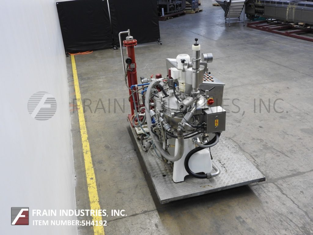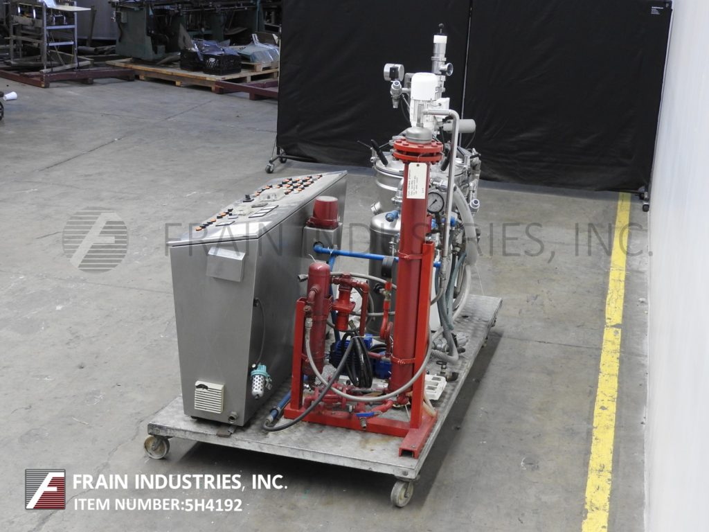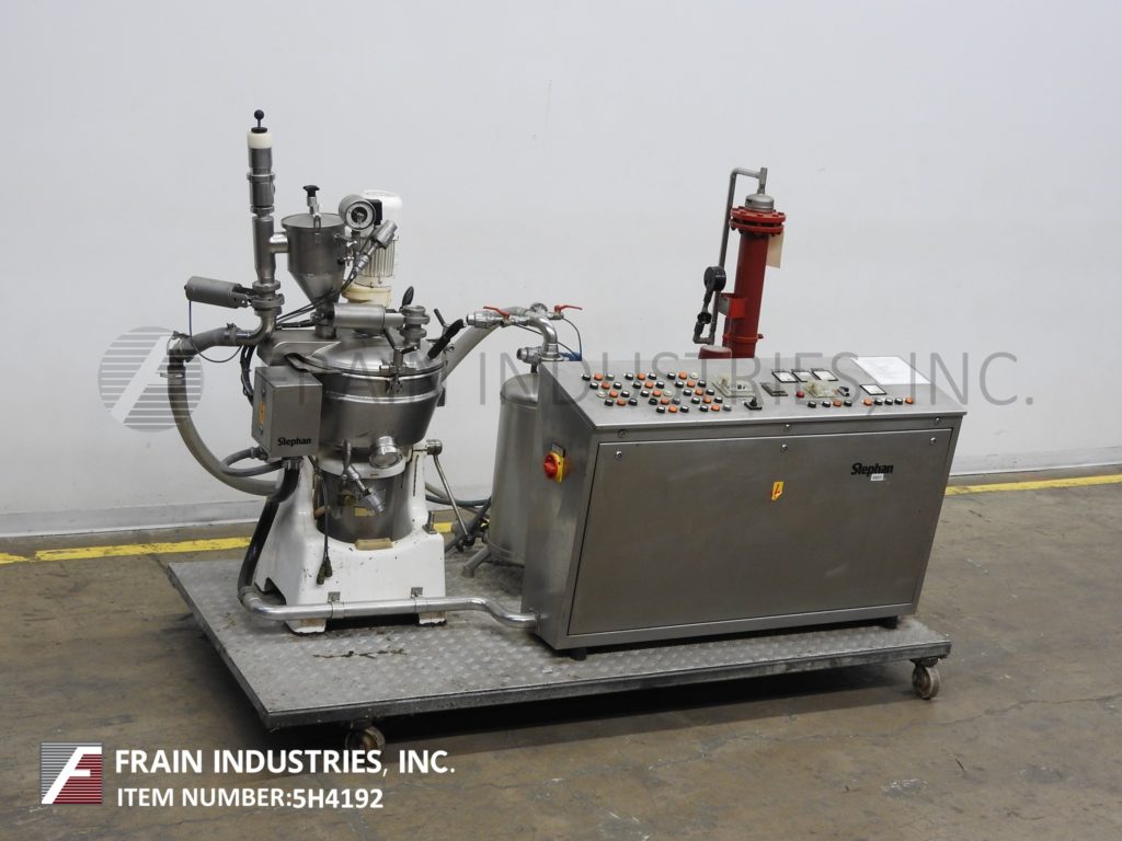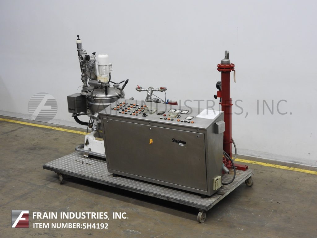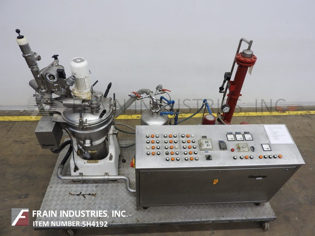 返回所有设备Stephan型号UMHC40E, 40升,不锈钢,蒸汽夹套,中试装置,真空锅,每小时产品重量的冷却器-取决于材料,应用和机器配置。碗的额定全真空和内部蒸汽压力额定值为55 psi。导管套额定压力为29 psi。最高工艺温度260°F.配有翻转,螺栓下盖,顶部安装侧刮式搅拌器,产品漏斗和真空表,直接蒸汽喷射,定时器,温度探头,锯齿叶片,侧底排放和锁定倾斜排放。辅助部件包括带真空泵的真空系统,冷凝罐,和冷热水连接。控制面板有产品,给水,夹套,真空,罐和冷凝器控制与恒温蒸汽温度和斩波定时器。安装在102英寸长x 51英寸宽的不锈钢平台上。专为中试工厂操作,可以手动运行,半自动或固态控制器的预先确定的程序,并可以在一台机器上生产广泛的产品程序,如精细切割,烹饪,混合,乳化,除气,在真空压力下加热和冷却杀菌、均质和巴氏杀菌