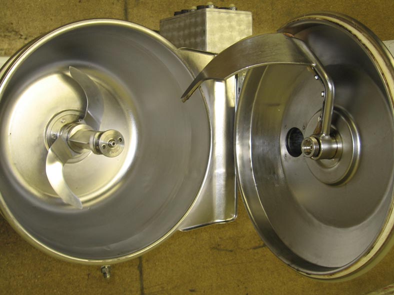 返回所有设备40夸脱,垂直,碗斩波器/混合速度取决于产品和混合时间。19 1/2“ID X 12”深裸照钢混合碗和顶盖,14“L底部双胞胎2速斩波/混合刀片,90°倾斜,带翻转,螺栓盖板和顶部安装真空压力表,1 /2低压套带1/2 HP顶侧刮板电机驱动器和两个速度1750/3500 12/16 HP底部斩波刀片电机驱动,控制器带有起动/停止,慢速/快,真空泵控制(VAC泵不包括VAC泵)
