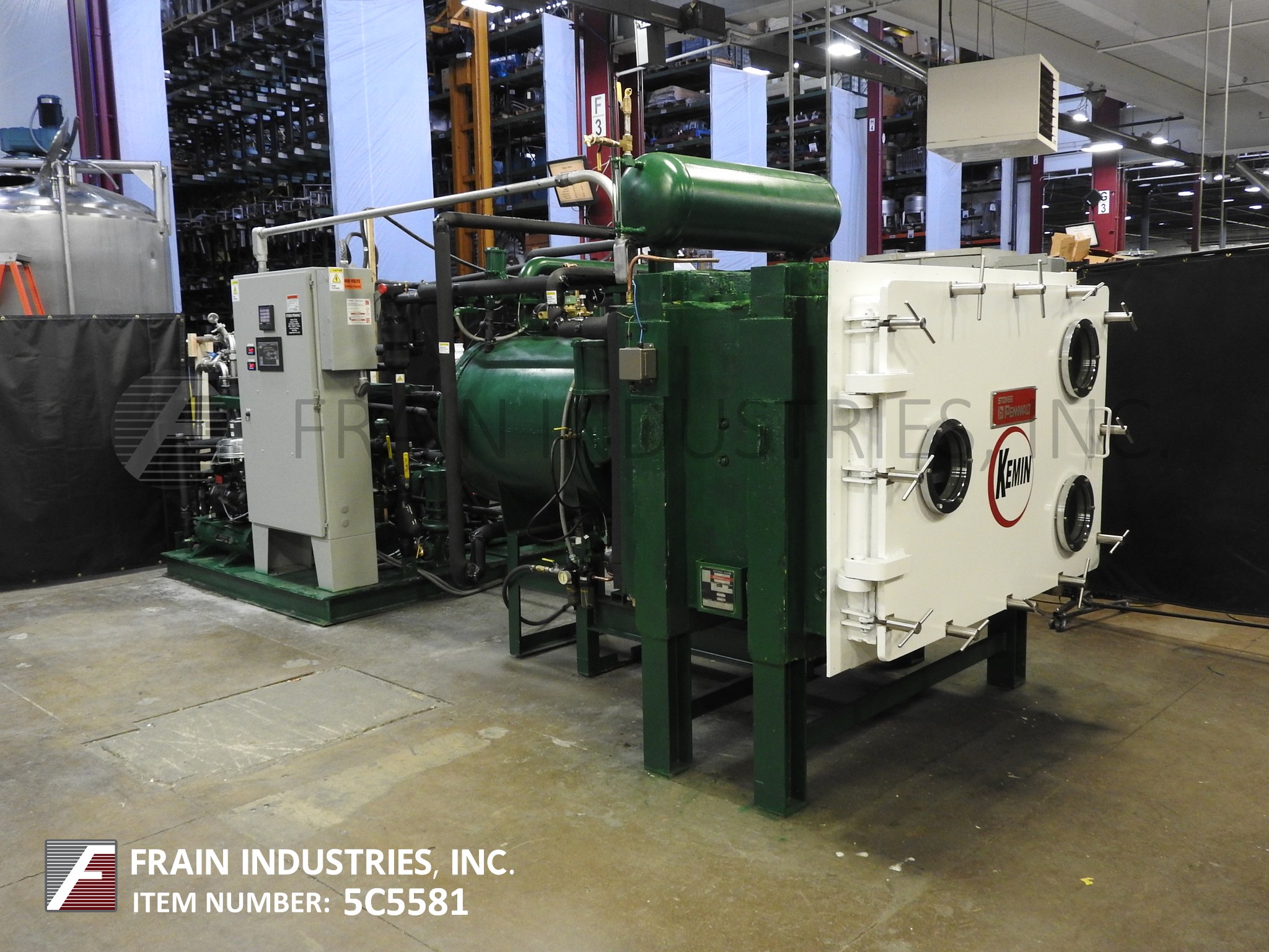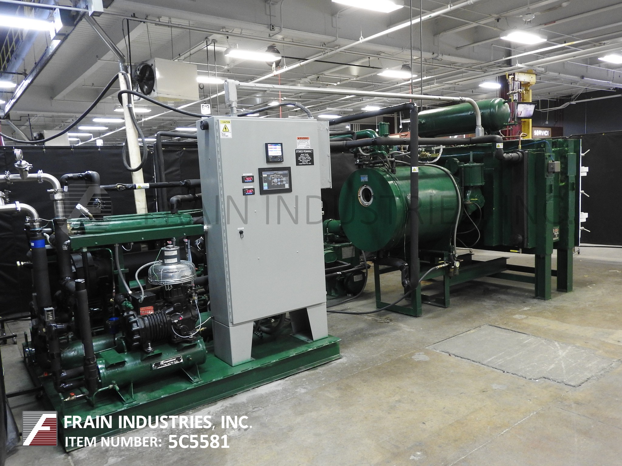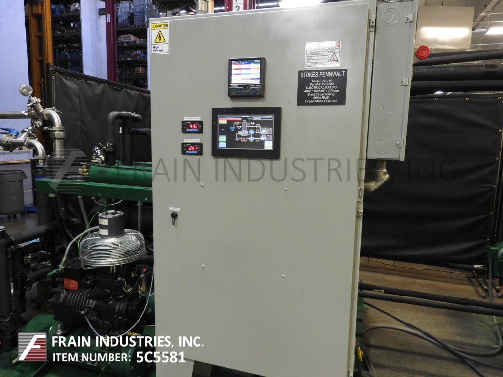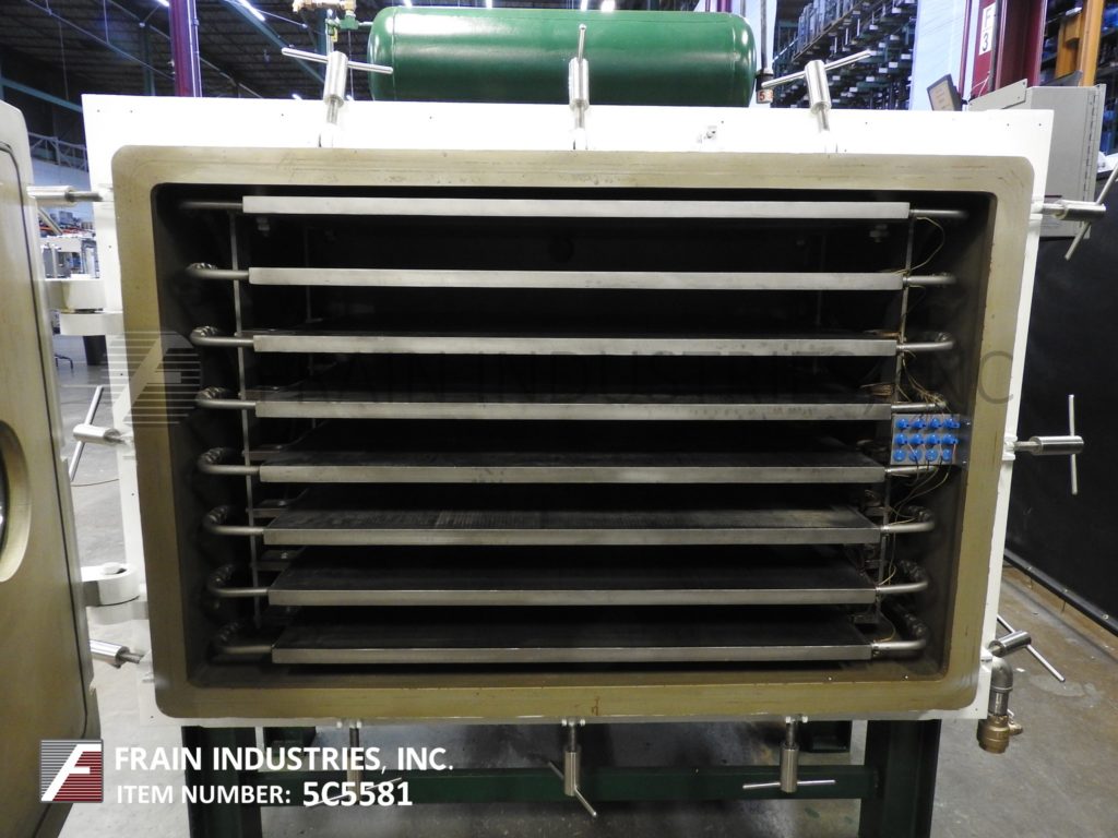 返回所有设备斯托克斯模型72-245冷冻干燥机(7)可用的货架48"宽x 36"深x 1-1/4"厚3-5/8"间隙,包括84平方英寸。货架温度在-40华氏度到180华氏度之间,在1.5小时内冷却从75华氏度到-40华氏度。撬装式外部冷凝器有(4)板,50平方英尺和100升负载能力在20毫米冰厚,并有一个挡板内部,以确保均匀的冰分布。制冷机组有一个约克(2)级20马力电机,使用氟利昂502制冷剂,并有一个Copeland半密封3hp辅助冷却系统。霍尼韦尔记录仪,真空压力表,真空压力记录仪,货架和冷凝器温度控制器和autoolyophilal AL-101 PLC控制。304不锈钢#4抛光。