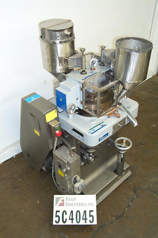 返回所有设备Stokes Model Pacer,自动,45站,旋转平板电脑压平额定高达4200粒/分钟 - 取决于材料和应用。最大工作压力为4吨。最大平板电脑直径7/16“。最大填充深度可调0”至11/16“,上部冲床入口可调节1/8”至3/8“。产品压实区没有颜料饰面,并配备过渡水平隧道进料器,可调节垂直料斗,手轮控制,浮动指南禁止,平板重量和较低的凸轮辅助,覆盖的上部停留凸轮,和弦座芯片排列。打孔长度较高:5-1 / 4“下5-1 / 4“。打孔直径:上3/4”下3/4“模具直径:.945”和模具深度:7/8“。安装在重型基础框架上。客户提供工具。
