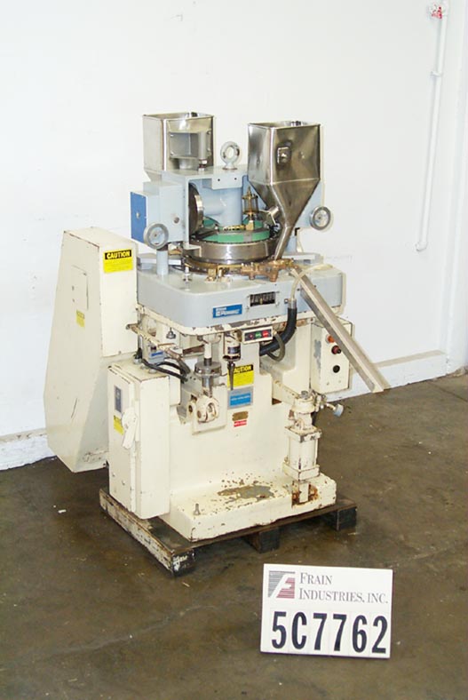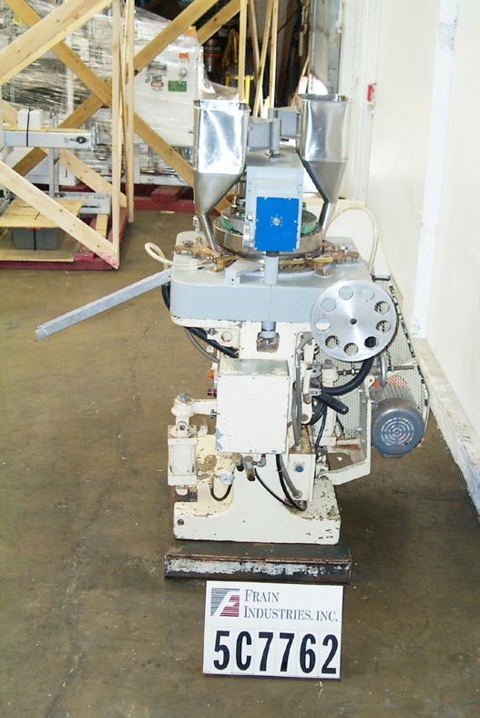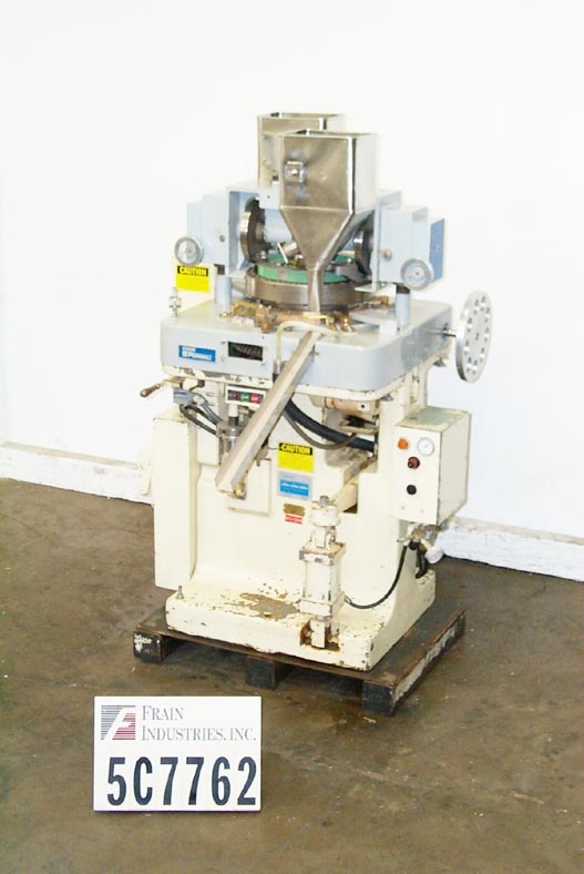 返回所有设备斯托克斯型起搏器,自动,35个工位,旋转压片机每分钟可达3200片-取决于材料和应用。最大工作压力4吨。最大片剂直径5/8"。最大填充深度可调0"至11/16",上冲床入口可调1/8"至3/8"。在产品压实区不含颜料。配备了运输水平隧道给料机,可调垂直料斗,手轮控制,浮动导向架,压片重量和下凸轮调整,覆盖上停顿凸轮和弦- loc模具安排。安装在重型基础框架。客户提供模具。