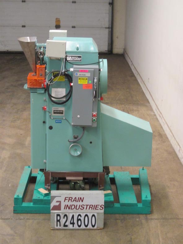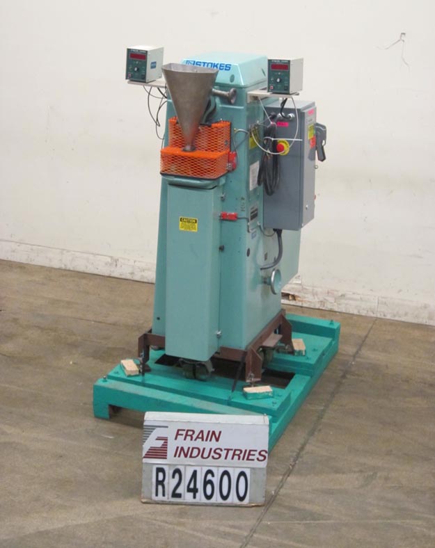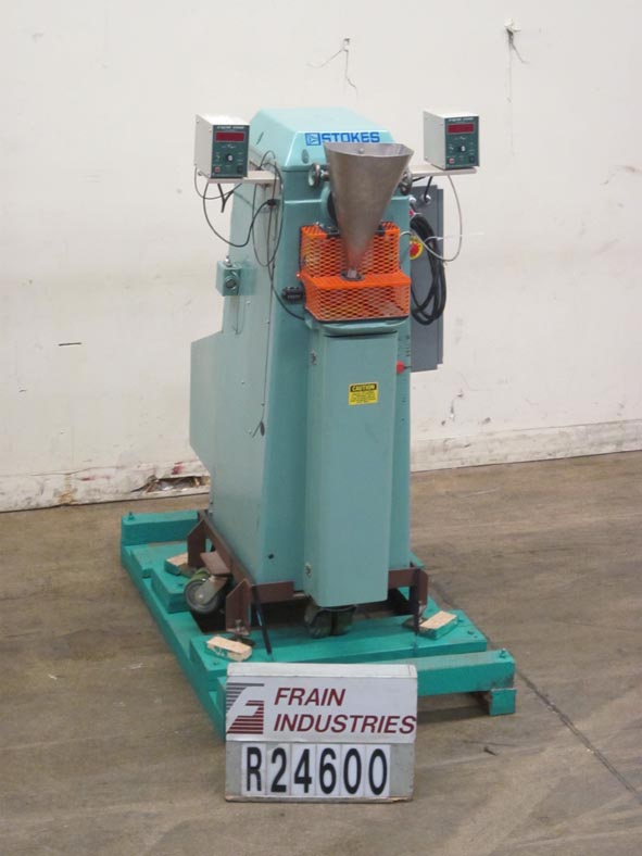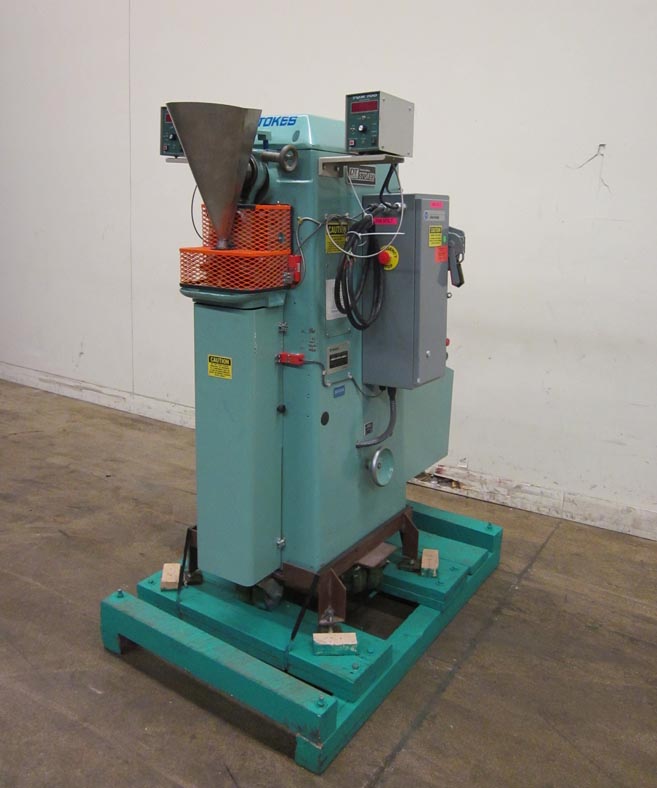 Back to All EquipmentAutomatic, single station tablet press. Tablet Diameter: up to 1-1/4". Fill Depth: up to 1-1/4". Operating pressure: up to 4 tons. Equipped with a 240 inch³ stainless steel product hopper, two TQM-700 punch force monitors and brass powder feeder. Mounted on height adjustable legs with casters. Rated from 10 to 58 tablets per minute – depending on materials, application and machine configuration. Tooling required per application.