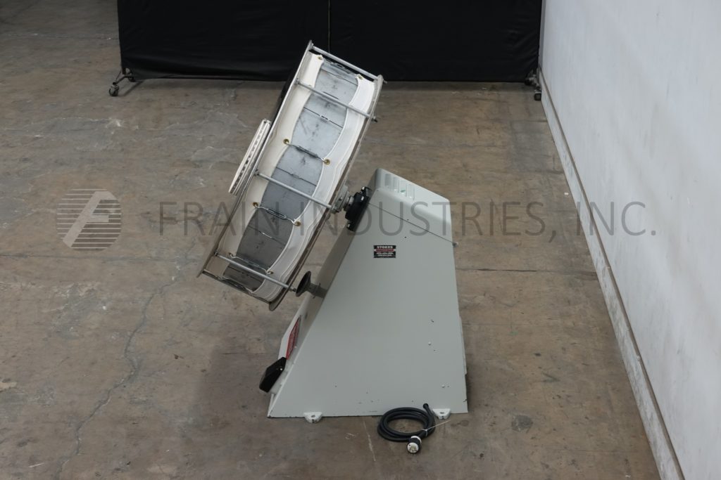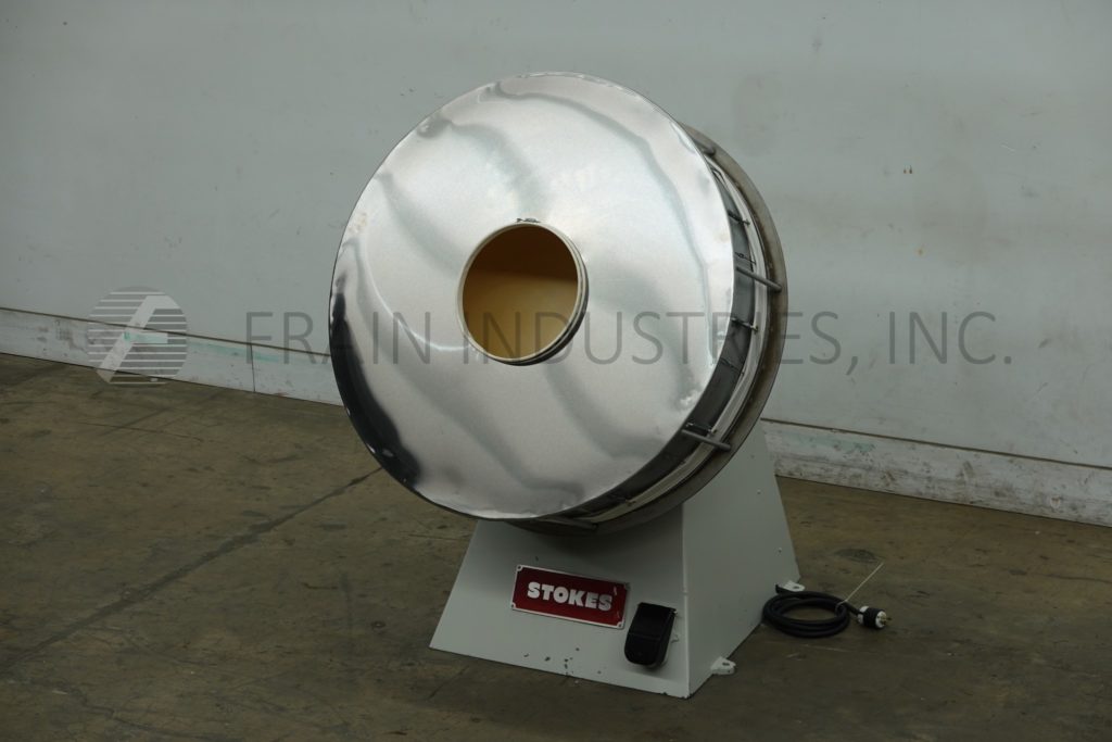 Back to All EquipmentStokes, Model 100VS stainless steel, cylinder shaped, coating pan with pounds of product per hour – depending on materials, application and operator dexterity. Equipped with 42" diameter x 14" deep coating bowl, 14" diameter product access port with 38" ground clearance. Mounted on painted base frame.