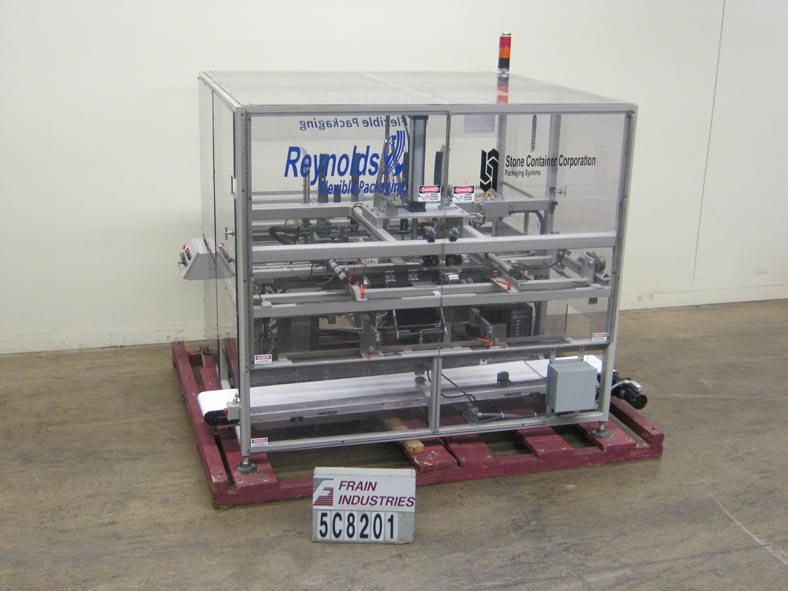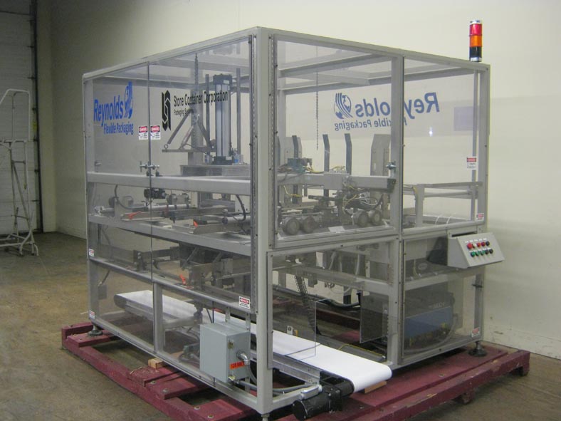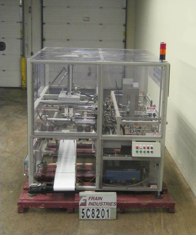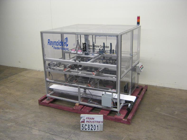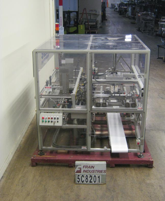 Back to All EquipmentAutomatic, hot melt glue, tray former rated 5 to 30 trays per minute – depending on materials and application. Tray size : 8" to 57" in Length x up to 14" in Width x up to 5" in Height. Equipped with 16" high blank magazine, 3 vacuum cup bottom blank magazine pick-off, 12" wide x 216" long flat belt conveyor, friction wheel transfer to forming station, adjustable forming head, with scales for size adjustments and 12" wide x 108" long discharge conveyor. Nordson hot melt glue system, A/B PLC , status light bar, barrier guarding with safety interlock and mounted on epoxy coated frame.