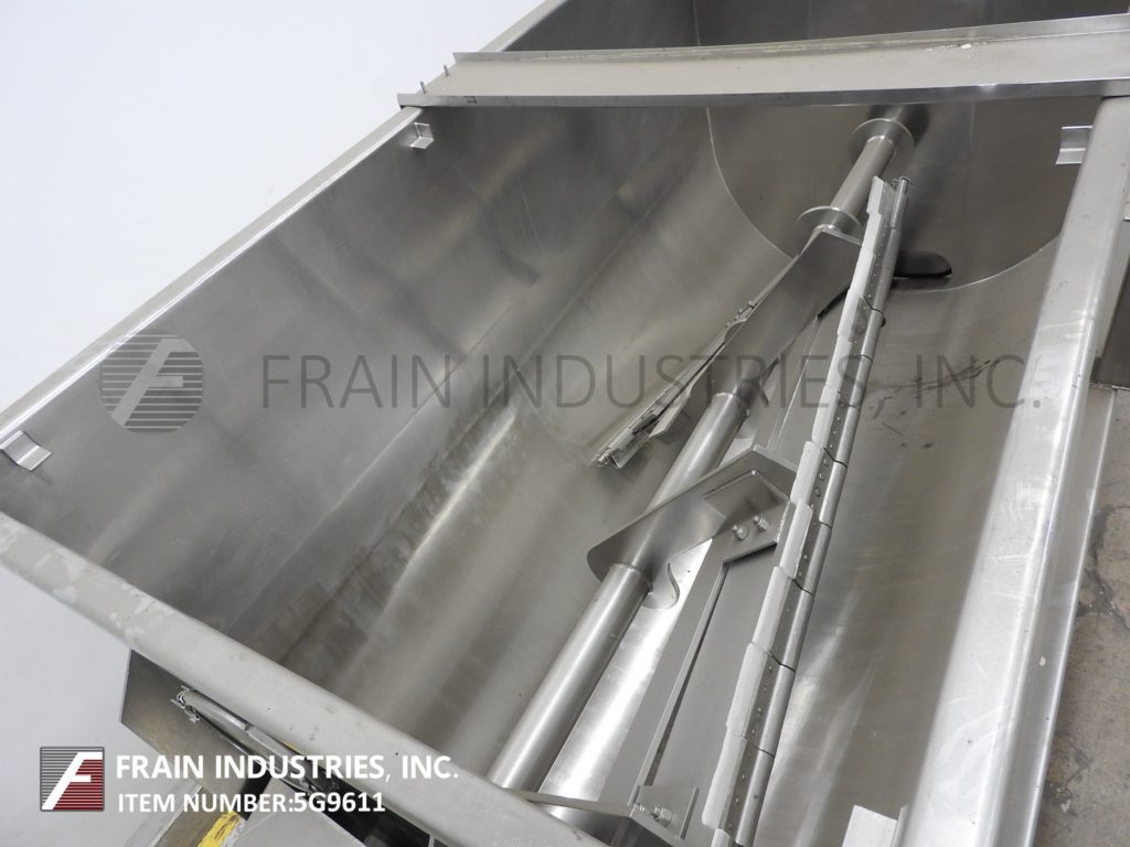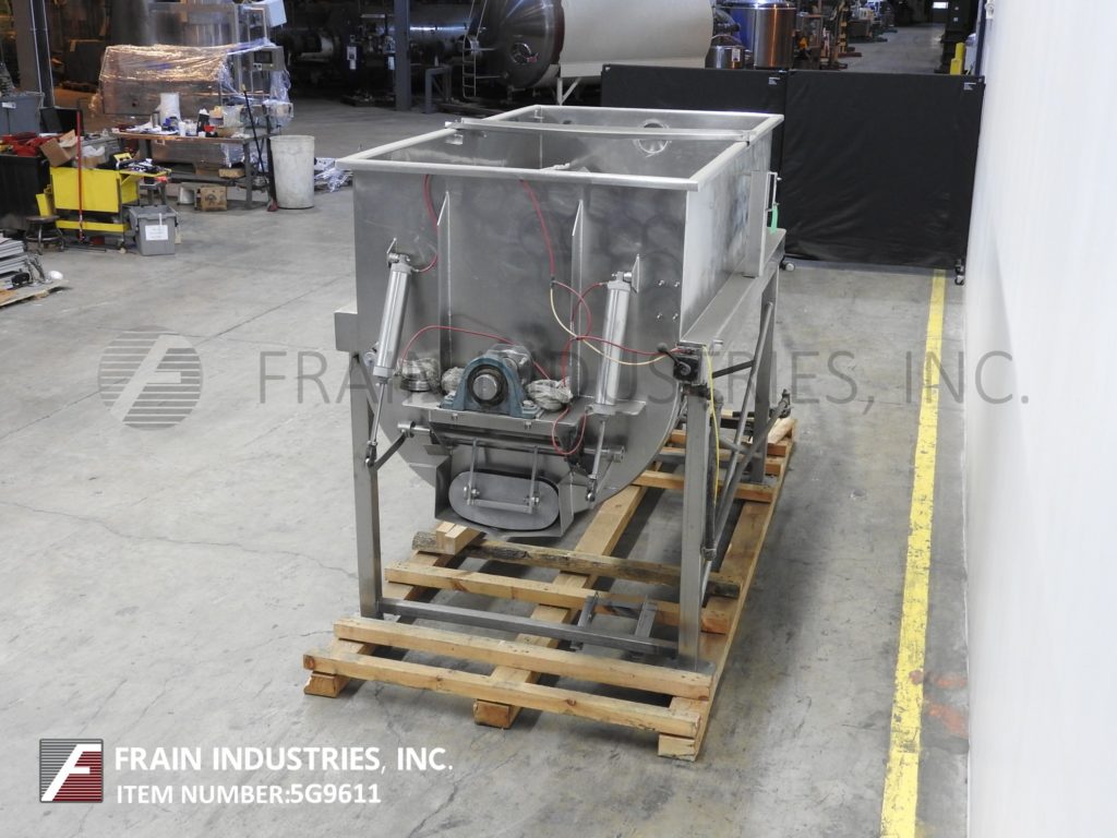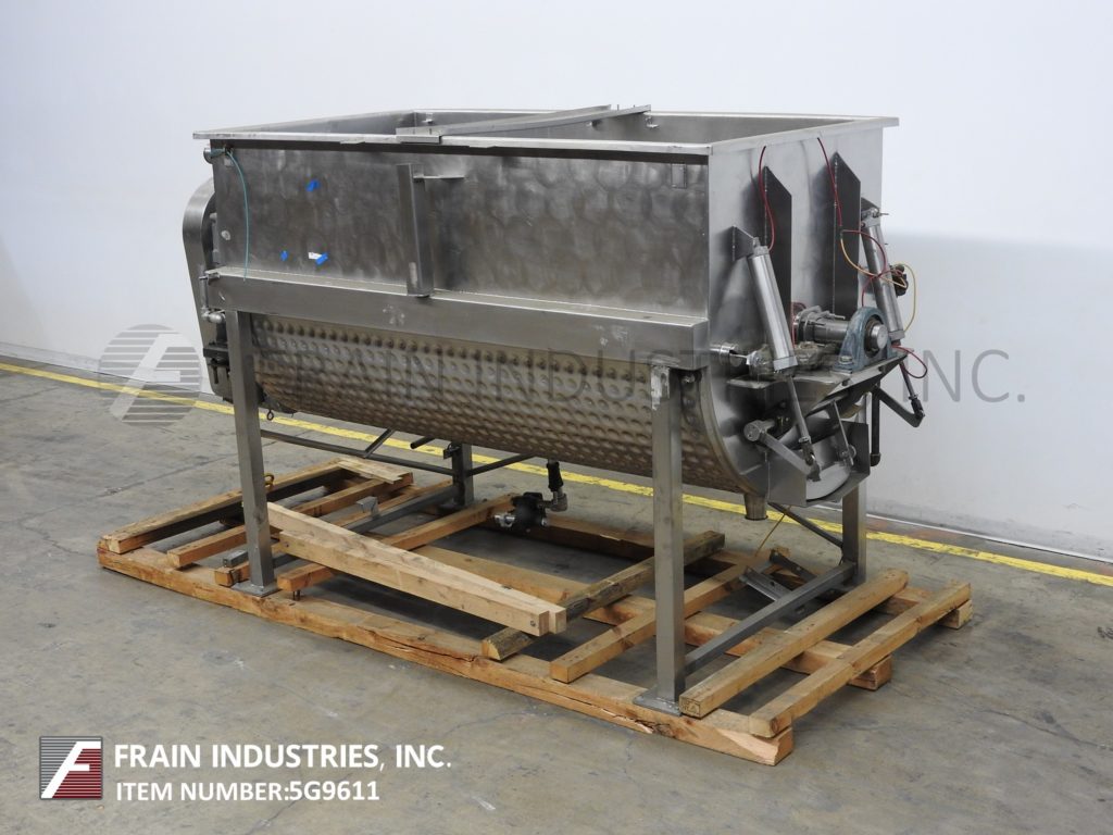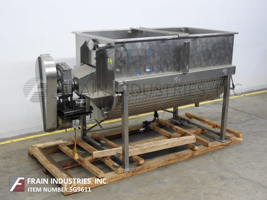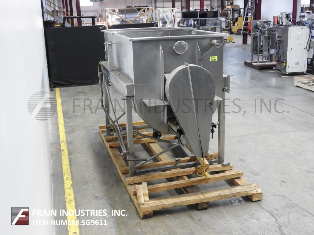 返回所有设备Stricklin,型号147,总容积130立方英尺(100立方英尺),316不锈钢,½波纹夹套,单运动桨叶搅拌机,每小时产品磅数-取决于材料,应用和机器配置。内室尺寸:96英寸长;49”宽;53深度”。配备3½“外径轴,(2)50”长的刮刀桨由7½马力驱动,(1)3½“外径/ 3”ID三夹式底部放电与20”地面间隙和(1)16“宽× 8”高端产品放电与气动冲洗门和23”地面间隙。