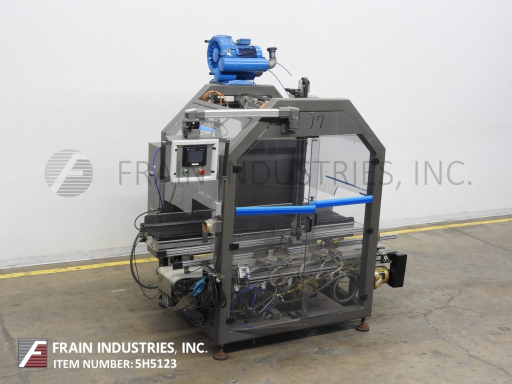 返回所有设备优越的,型号700 Robopacker,自动,伺服驱动的机器人盒包装器,从5到40个机器人周期的每分钟额定数量,产品数量 - 取决于材料,应用和包装图案。封装尺寸范围:长度为6“至14”;1.5“宽度为8”;高度1“至3.5”。案例尺寸范围:10“至24”的长度;6“到16”的宽度;高度4“至12.5”。能够处理枕头袋,立式袋,柔性制品,纸箱,贵宾,瓶子,流量包装产品,泡罩包装,不规则形状的产品,每分钟均匀的40次循环类型:RSC顶部载荷盒,HSC案例,显示壳体,托盘,刨花板容器,塑料手提包,具有适当变化零件的塑料托盘。配备78“长X 14”宽滑动扭矩产品,进给输送机,机器人真空拾取N置于真空系统和90“长x 14”宽空盒,进给输送机,可调节导轨。 Control panel has AB PLC and panel view HMI controller. Mounted on heavy duty base frame with (4) height adjustable legs.