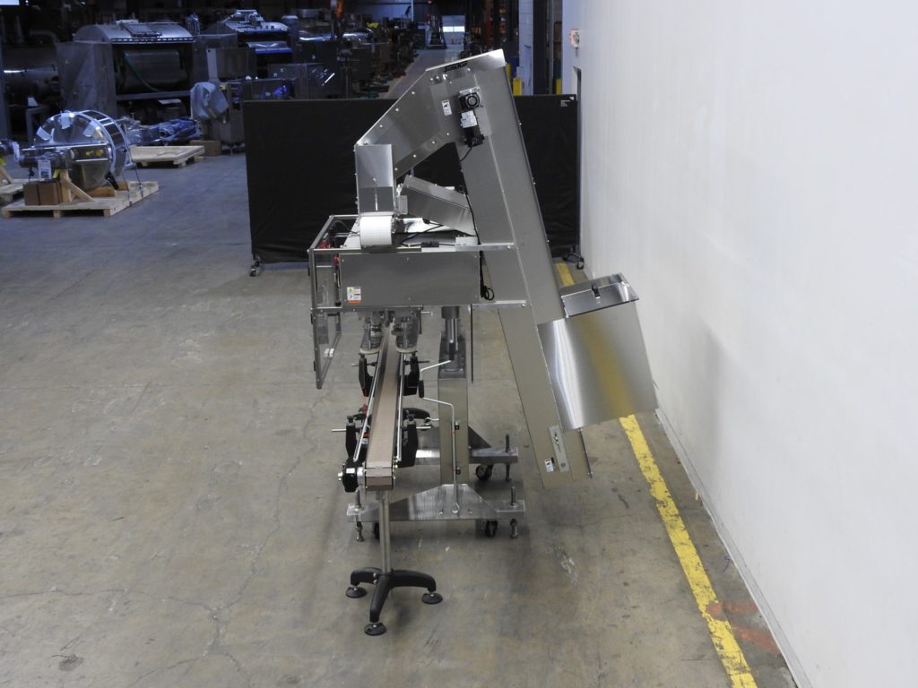 返回所有设备SureKap型号SK6000 BF6-70,自动,在线,不锈钢,3站,6主轴滚过输送机盖和盖给料器的数量每分钟-取决于材料和应用盖的尺寸范围:22mm至70mm。配备120“长x 4 1/2“宽不锈钢容器输送机,21”长x 25“宽x 18”深(4英尺³)盖料斗、77”长x 6“宽电梯2½”高防滑钉6”中心,46“长x 5½“宽帽喂养/排序带,可调节帽斜槽,24”长x 1”宽单容器爪腰带,(3)手动曲柄可调(6)主轴台(2)套机械离合器用于增加扭矩控制。控制面板与主轴和夹持控制盘,启动和e-stop按钮。安装在重型不锈钢框架与脚轮。