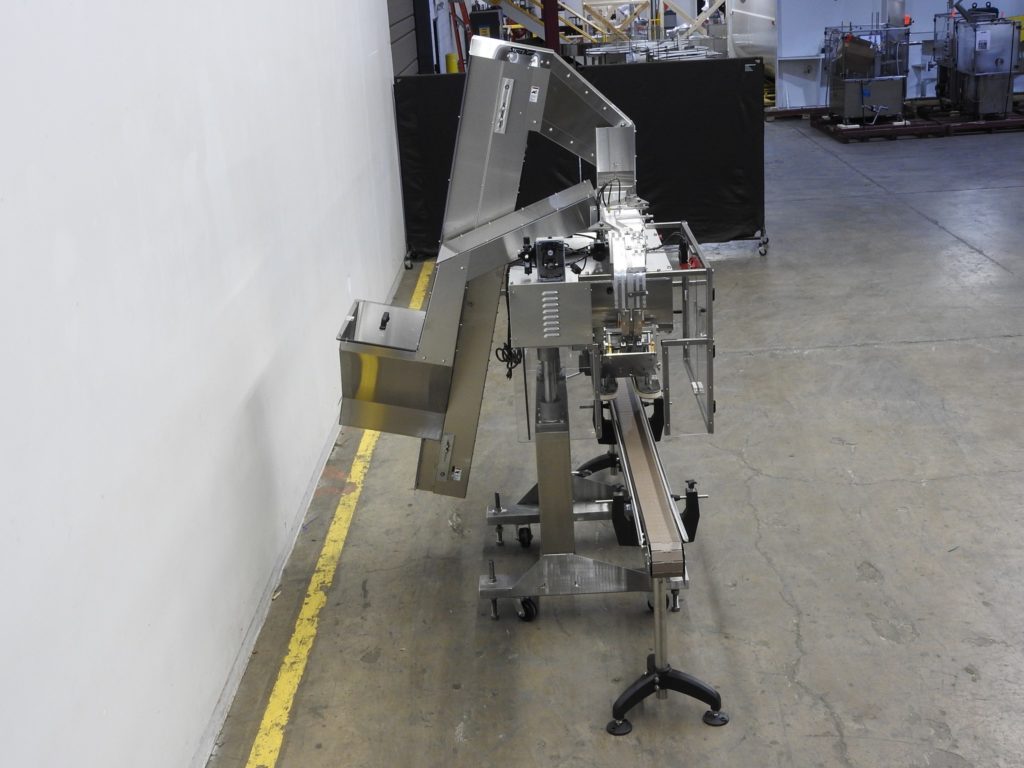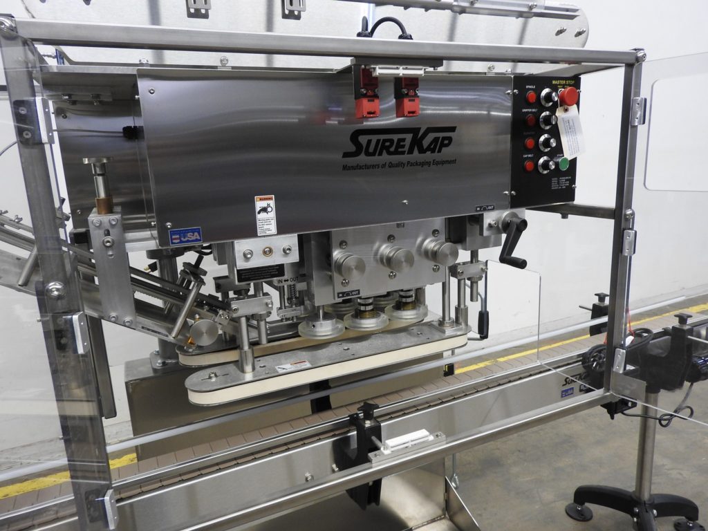 返回所有设备SureKap型号SK6000 BF6-70,自动,在线,不锈钢,3站,6主轴滚过输送机盖和盖给料器的数量每分钟-取决于材料和应用盖的尺寸范围:22mm至70mm。配备120“长x 4 1/2“宽不锈钢容器输送机,21”长x 25“宽x 18”深(4英尺³)盖料斗、77”长x 6“宽电梯2½”高防滑钉6”中心,46“长x 5½“宽帽喂养/排序带,可调节帽斜槽,24”长x 1”宽单容器爪腰带,(3)手动曲柄可调(6)主轴台(2)套机械离合器用于增加扭矩控制。控制面板与主轴和夹持控制盘,启动和e-stop按钮。安装在重型不锈钢框架与脚轮。