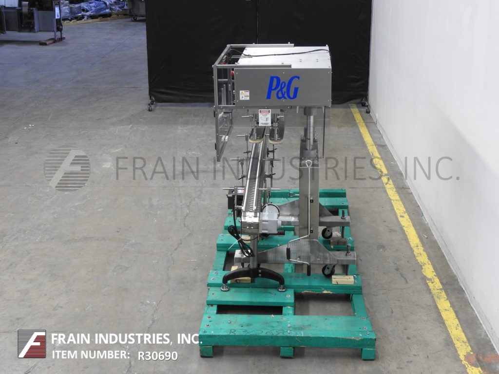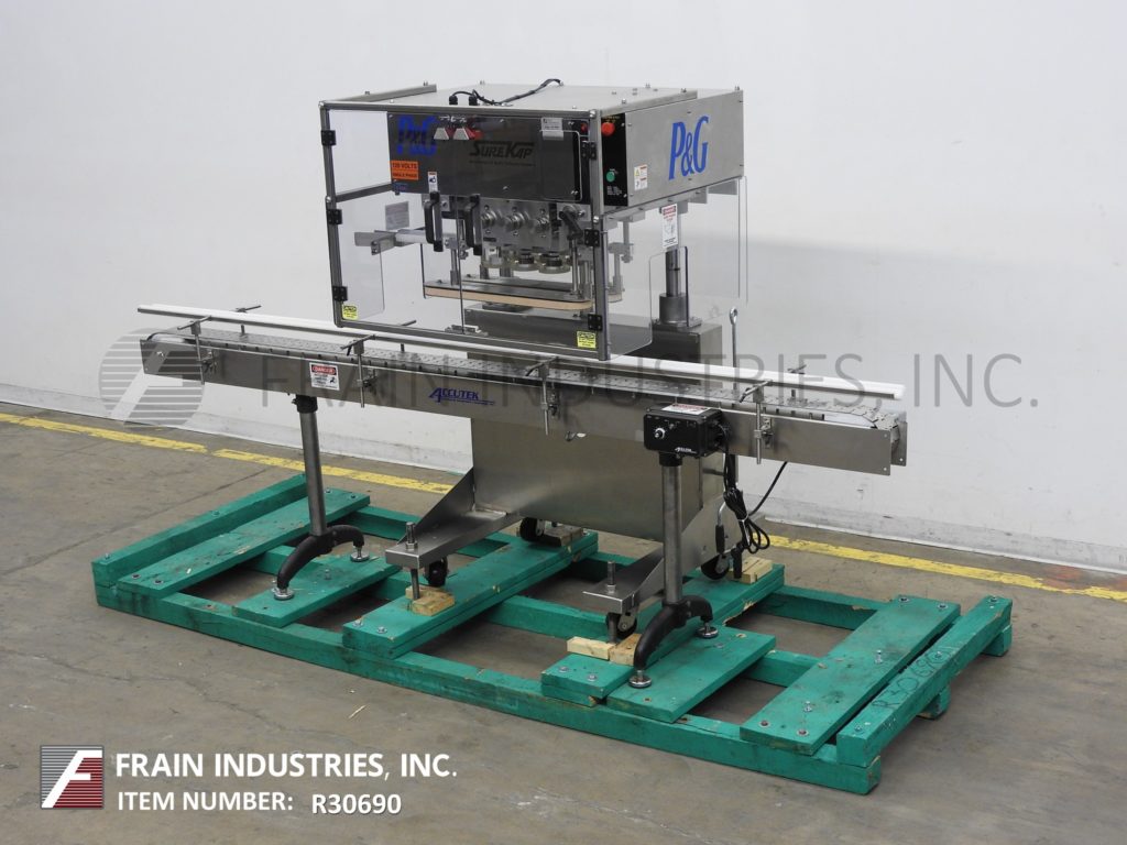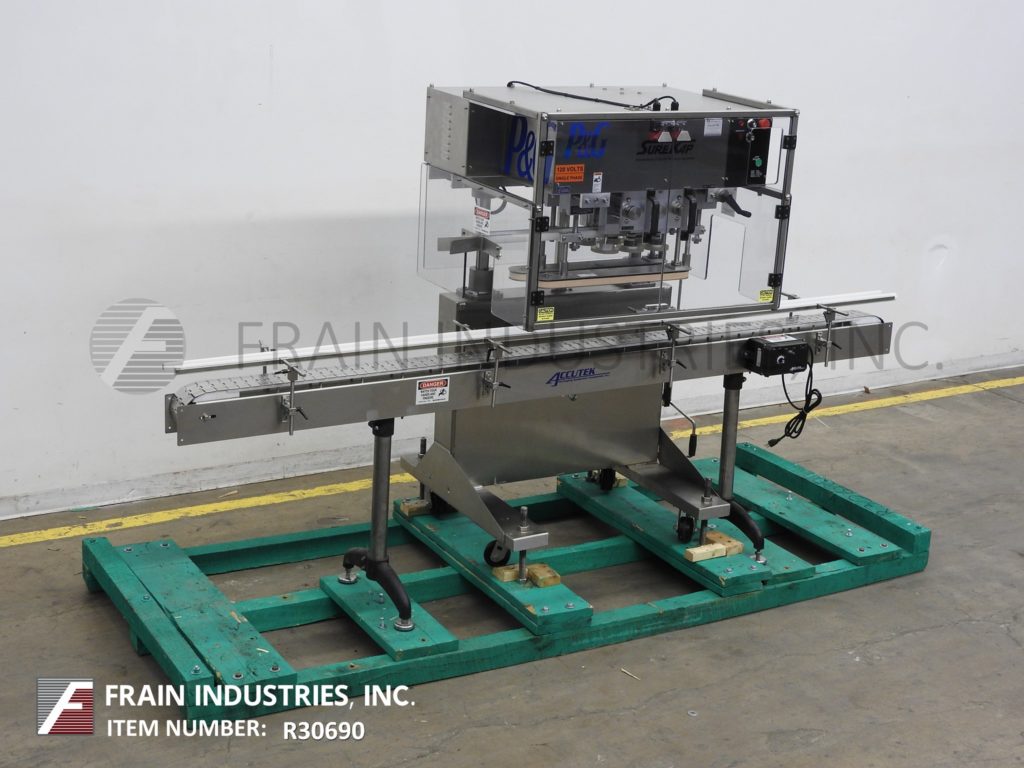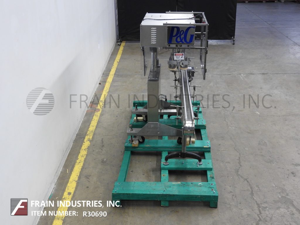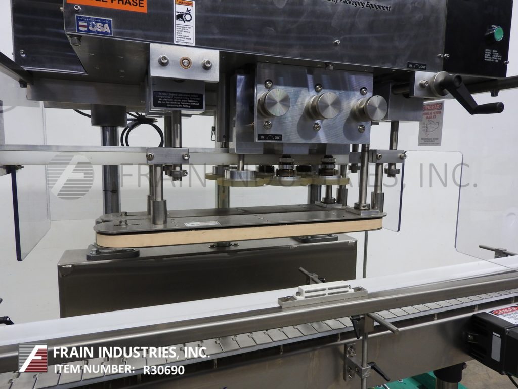 SureKap型号SK600,半自动,内联,不锈钢,3工位,6主轴帽拧紧和重新扭转机,输送带额定为每分钟10至90个容器-取决于材料,应用和操作熟练度。瓶盖尺寸范围:直径8毫米至110毫米。配备120"长x 4-1/2"宽不锈钢容器输送机,24"长x 1"宽单容器夹持带,(3)手曲柄可调主轴站(2)套离合器。控制面板与主轴和夹具控制刻度盘,启动和e-stop按钮。安装在重型不锈钢“C”基础框架与脚轮和调平腿。