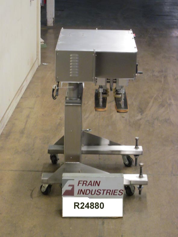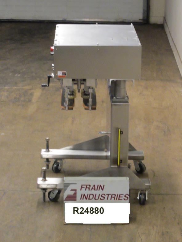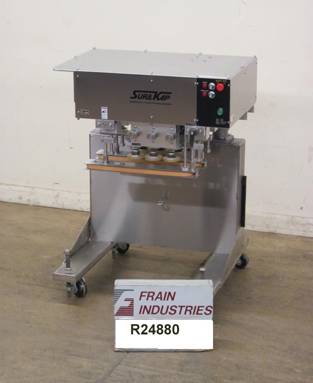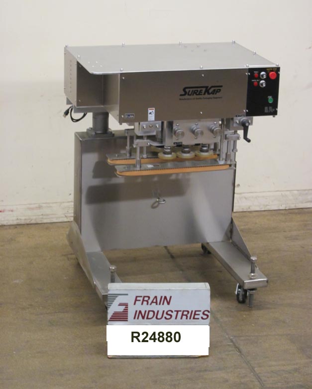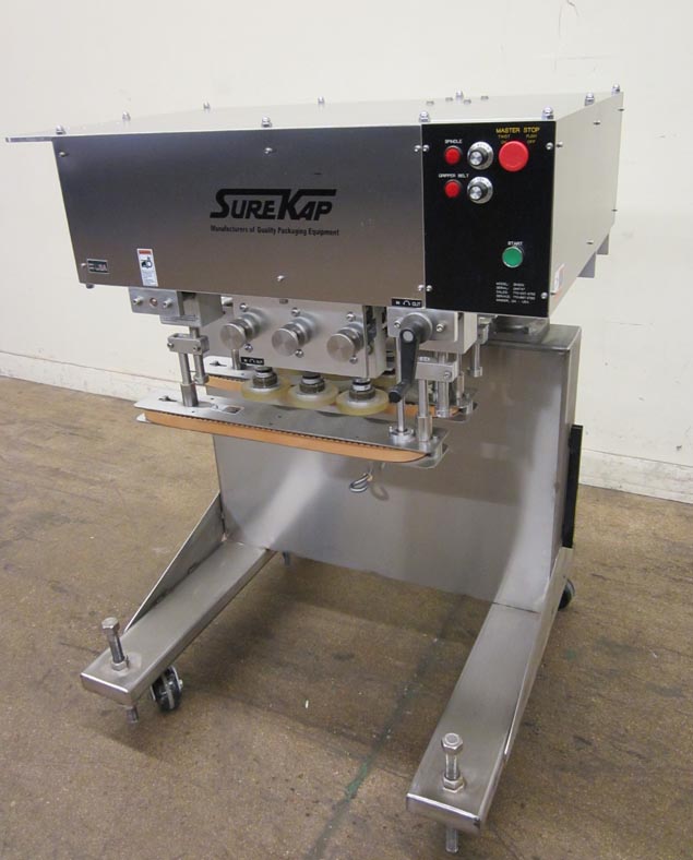 返回所有设备Surekap Model SK600,SEMI自动,内联,滚动输送带/重击,每分钟容器数量 - 取决于材料,应用和操作员灵活性。帽尺寸范围:直径8毫米至110毫米。配备前旋钮可调节3站,6个主轴拧紧段,配有(2)套离合器,24英寸长x 1“宽单个容器夹具带。带主轴和夹持速度控制拨盘的控制面板,以及启动/ e-stop按钮。用脚轮安装在手曲柄高度可调框架上。