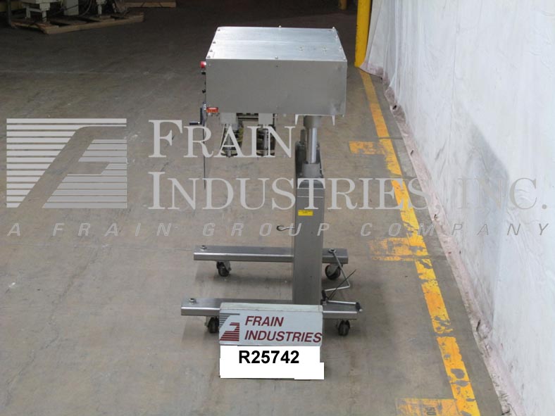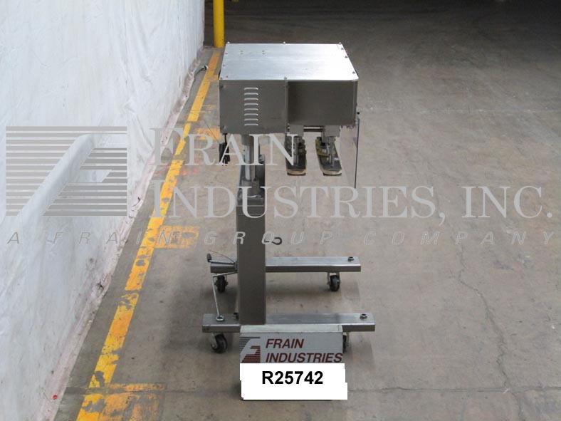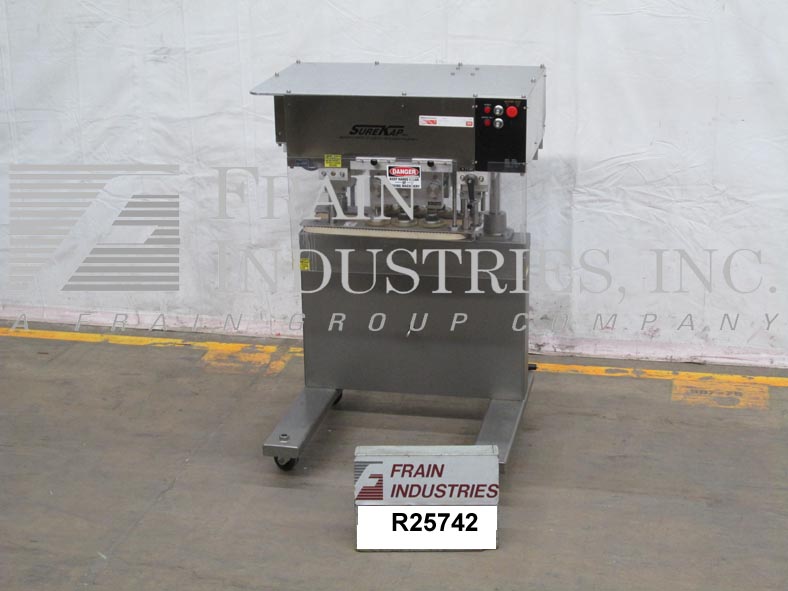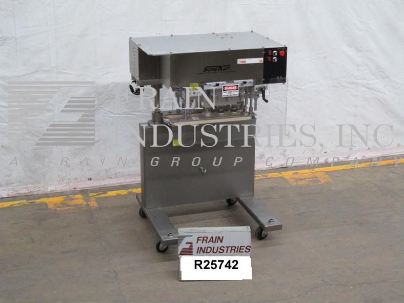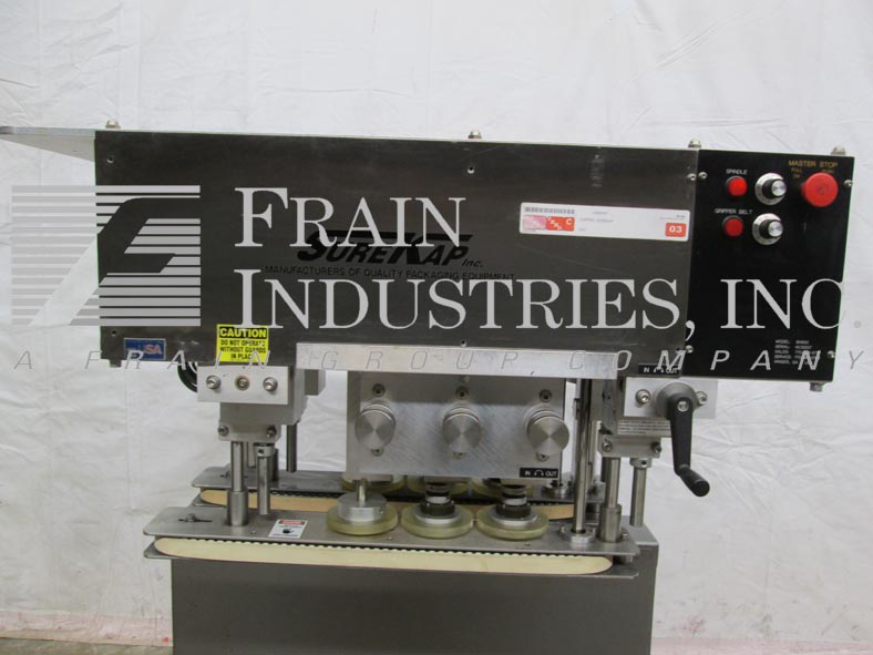 返回所有设备Surekap Model SK600,SEMI自动,内联,滚动输送带/重击,每分钟容器数量 - 取决于材料,应用和操作员灵活性。帽尺寸范围:直径8毫米至110毫米。配备前旋钮可调节3站,6个主轴拧紧段,配有(2)套离合器,24英寸长x 1“宽单个容器夹具带。带主轴和夹持速度控制拨盘的控制面板,以及启动/ e-stop按钮。用脚轮安装在手曲柄高度可调框架上。